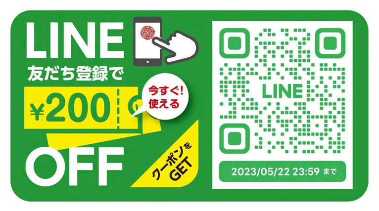 BINO栄店オープンを機に、LINE公式アカウントを開設いたします。この機会に「お友達追加」をお願いいたします。只今、オープンを記念して「今すぐ使える!LINEお友達登録で200円割引クーポン」を配布中(2023年5月22日まで)