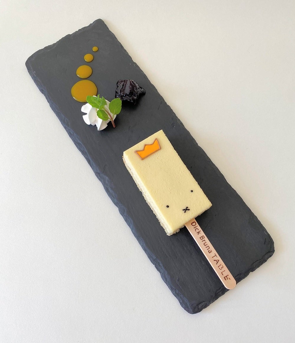 ポップアップショップで税込み3,000円以上お買い上げのレシートを持参して、横浜店内でミッフィーチーズケーキバーを注文すると、特別に王冠モチーフのトッピングを付けて提供します。ミッフィーチーズケーキバーはディック・ブルーナ テーブルの定番スイーツで、濃厚プレーンのチーズケーキです。