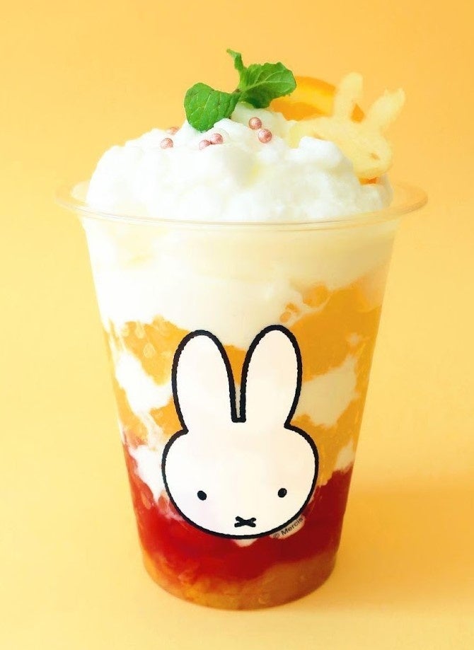 ポップアップショップ開催期間中の特別なスイーツとして、夕焼けオレンジゼリーが新登場します。夕焼けイメージのオレンジ味とブラッドオレンジ味の2層のオレンジゼリーの間にヨーグルトムースとミルクホイップの雲が浮かぶ、見た目もあざやかなスイーツです。ミッフィーの形のリンゴのトッピングのほか、あっさりした夕焼けゼリーの下にもフルーツのシロップ漬けが入っていているので、食べ応えも抜群です。