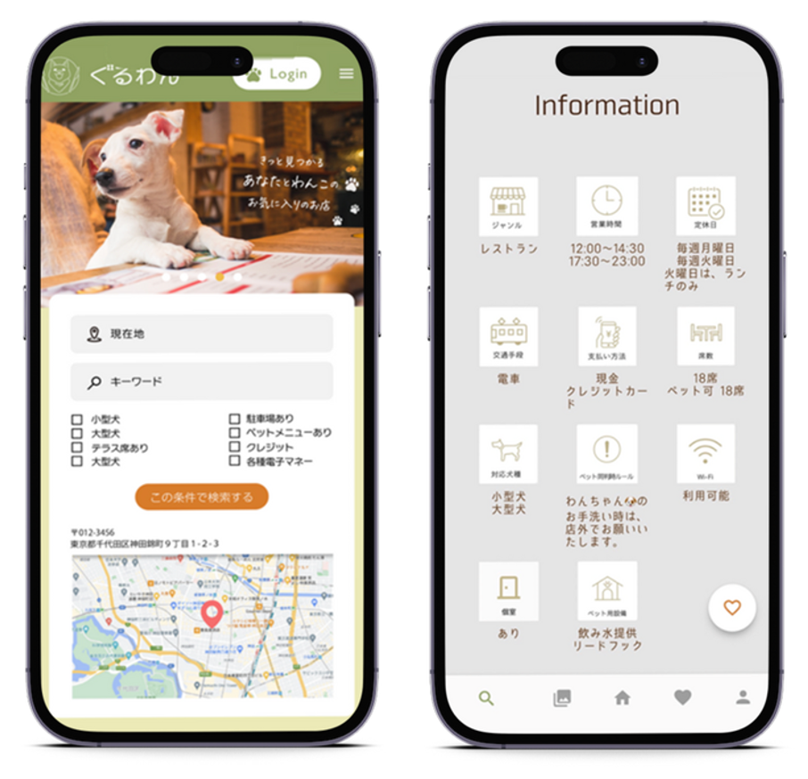 ぐるわんは、わんちゃん同伴可能飲食店や宿泊施設の詳細可視化サービスアプリです。大手飲食店口コミサービスサイトには、「ペット可」の記載はあるものの、ペット同伴可能範囲やドッグメニューの有無などペットに関する詳細な情報は記載されておらず、実際に店舗に行った際にギャップが生じてしまっ