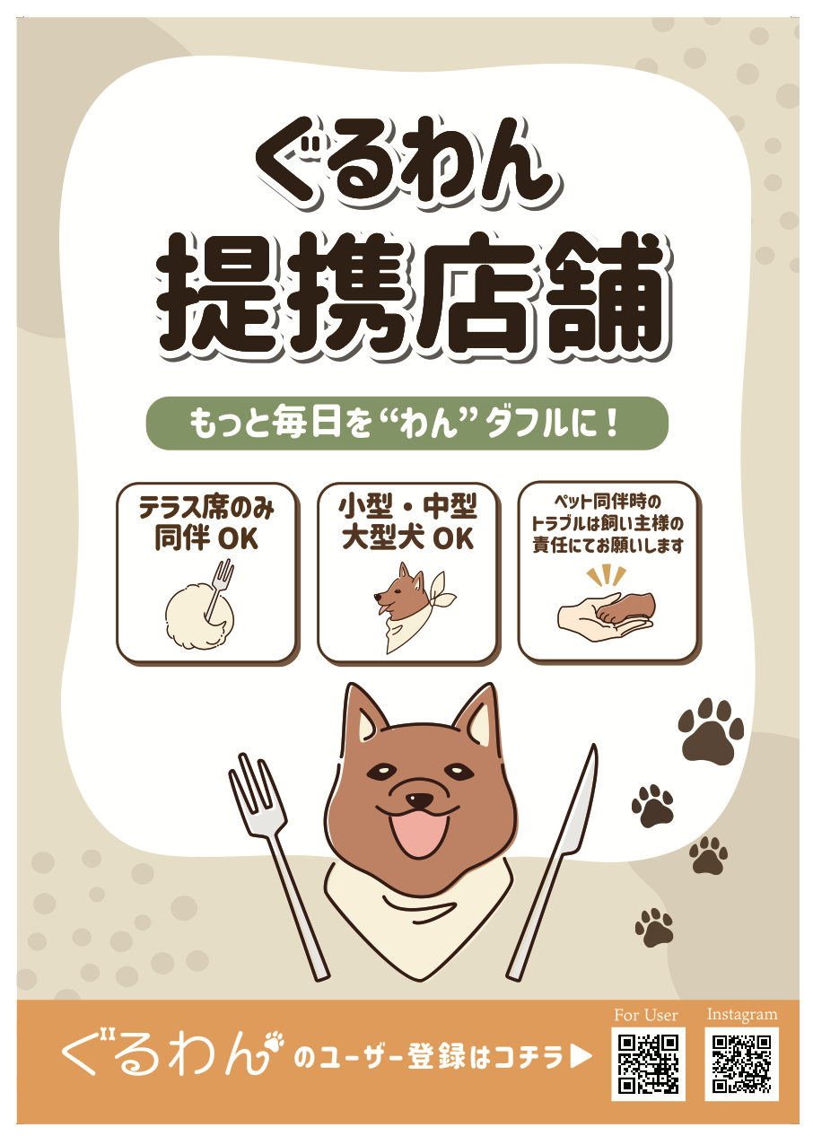 ぐるわんは、わんちゃんと人間の共生社会の実現のため、一緒にわんちゃんと飼育者のより豊かな日常を応援し、盛り上げていただける飲食店、宿泊施設を対募集しております!