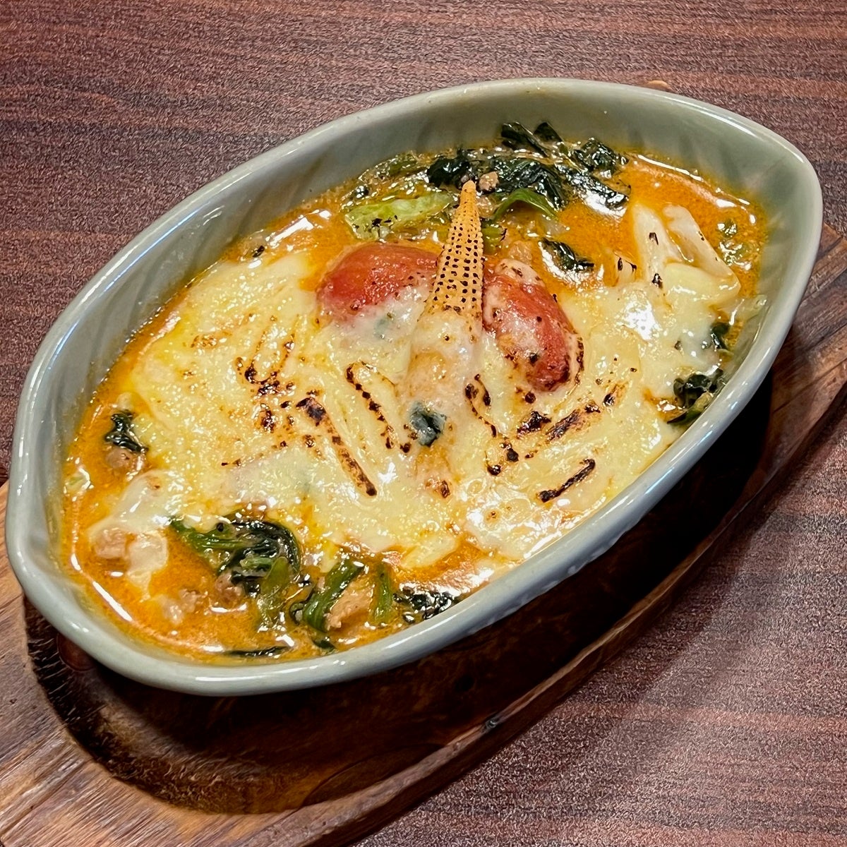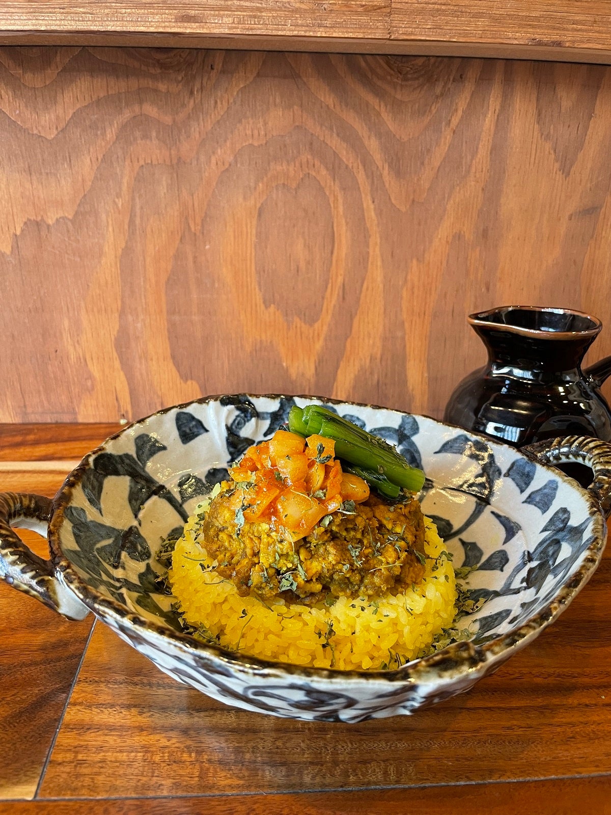 キャベツ、ほうれん草、トマト、ヤングコーンなどの野菜とキーマを炒め、オリジナルルーと合わせて炙りチーズをかけました。ライスは独自ブレンドの麦ご飯を使用