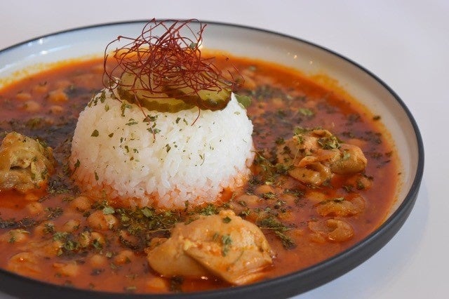 Kikuchi Curryの人気メニューをイベント用にブラッシュアップ。油と塩にこだわり骨付きもも肉をホロホロになるまで長時間煮込んで旨味を凝縮。国産米やビール、赤ワインとも相性抜群