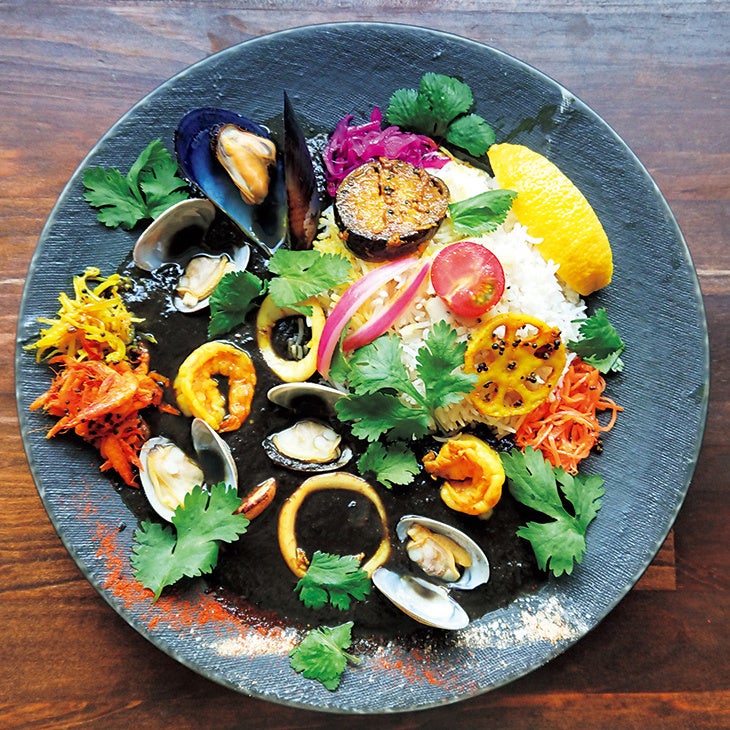 魚介の旨味をふんだんに閉じ込めたイカスミリゾットのようなシーフードカレー。駿河湾産の桜エビとシラスのアチャールをトッピング。