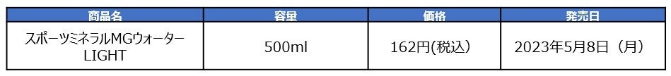 本品は、既存品である『スポーツミネラルMGウォーター』の姉妹品であり、マグネシウム含有量を3分の1(50mg/本)にすることで、飲みやすさを追求しました。『スポーツミネラルMGウォーター』は1日1本で効率良く不足分のマグネシウムを摂取したい方に、『スポーツミネラルMGウォーターLIGHT』はスポーツ中やスポーツ前後に水分補給と共にマグネシウムを手軽に摂取したい方におすすめです。