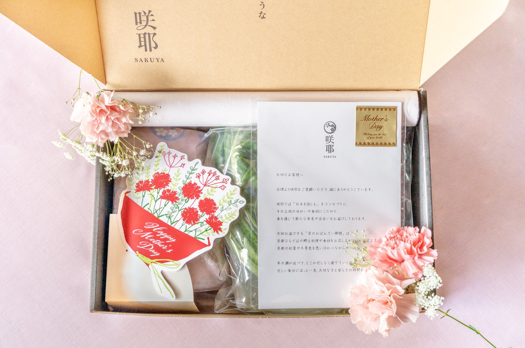 箱を開けていただくと母の日カードが一番に目に入る特別ラッピング。大切なお母様へ感謝の気持ちをお伝えいただけます。(お花はイメージです)