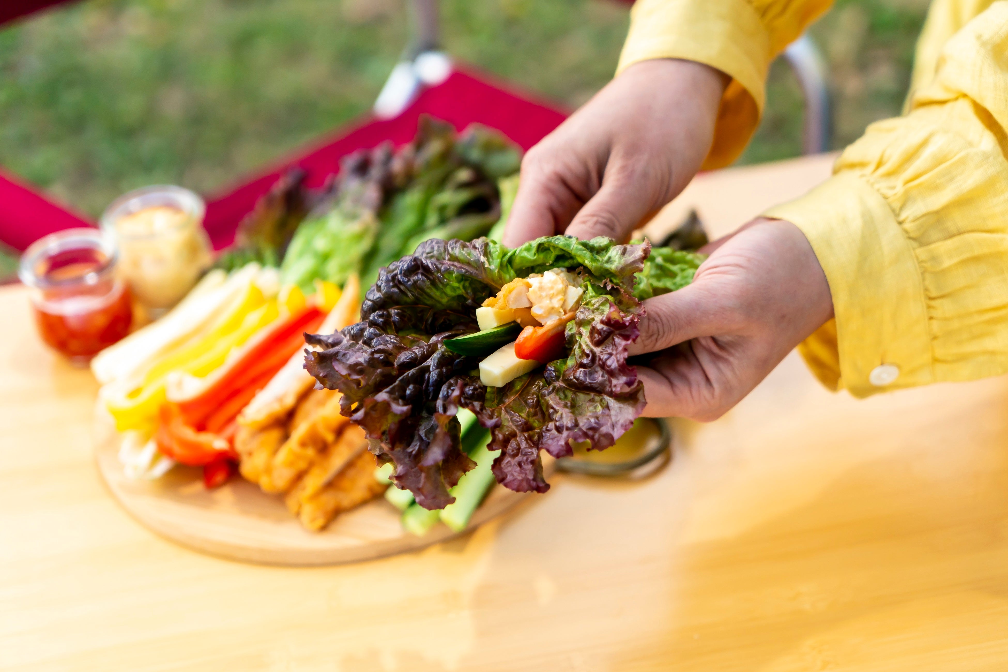 4:サニーレタスに具材をのせ、ブーケのようにくるりと包めば完成です。