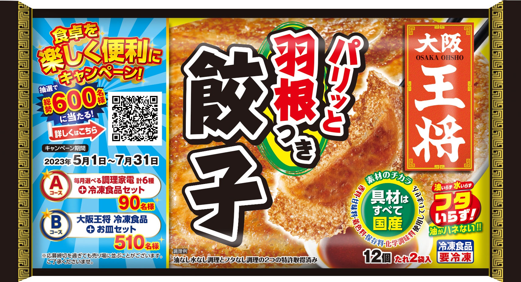 1ヶ月ごとに選べる景品が変わり、抽選で総勢600名様に大阪王将冷凍食品詰め合わせと、人気調理家電や大阪王将お皿セットが当たります。
