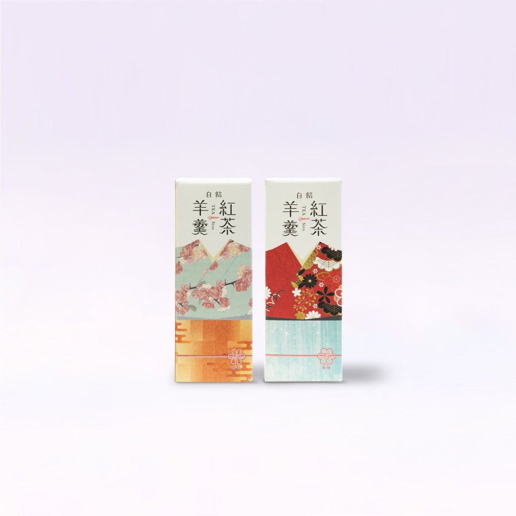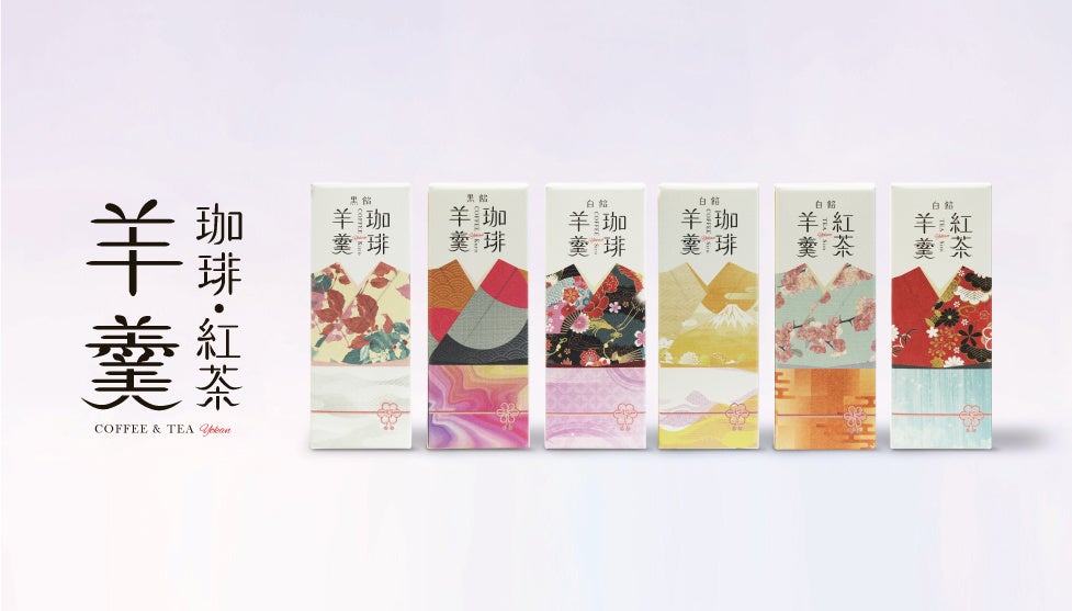 パッケージはカラフルで華やかな着物柄をあしらい、モダンな和風テイストに。珈琲羊羹の黒餡・白餡、紅茶羊羹の全3種、各パッケージの表面と裏面で異なるデザインがお楽しみいただけます。海外観光客のお土産やちょっとした贈り物にもおすすめです。