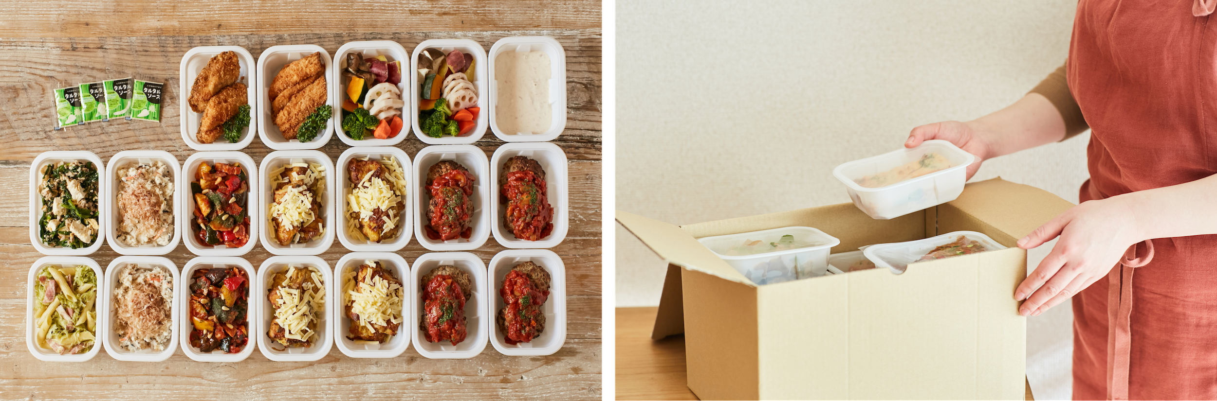 調理経験豊富なシェフと管理栄養士が監修し、専用キッチンで手作りしたお惣菜を、毎週ご家庭に冷蔵でお届けする宅食サービスです。1食あたり700円台(5食プランの場合749円)で炊事に関わる家事をお任せいただけます。現在1,000レシピ以上の料理を週替わりで提供しています。