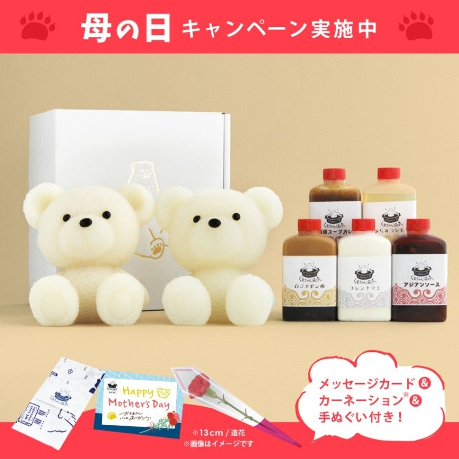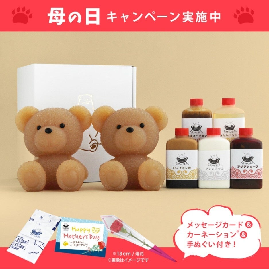 「北海道めんこい鍋 くまちゃん温泉」は、温泉に浸かっているような“くまちゃん”(食物繊維とコラーゲンで固めた出汁)のかわいさで人気の、札幌発 “かわいい!(めんこい)一人鍋専門店”です。現在店舗は、渋谷宮益坂店と北海道札幌市札幌本店の2 店舗のみで、連日満席、予約は常に1か月待ちと大人気。「北海道めんこい鍋 くまちゃん温泉」のオンラインショップも、完全予約制をとっており、発売日にはご注文が殺到、わずか数時間で売り切れとなっておりました。そこでこのたび、より多くのお客様へ「北海道めんこい鍋 くまちゃん温泉」をお届けするために、2023年5月より毎日数量限定で常時販売させていただきます。毎日販売しているので、自分へのご褒美はもちろん、記念日ギフト、とっておきのお取り寄せディナーにもおすすめ。母の日ギフトとして、ギフトセットもご用意しております。