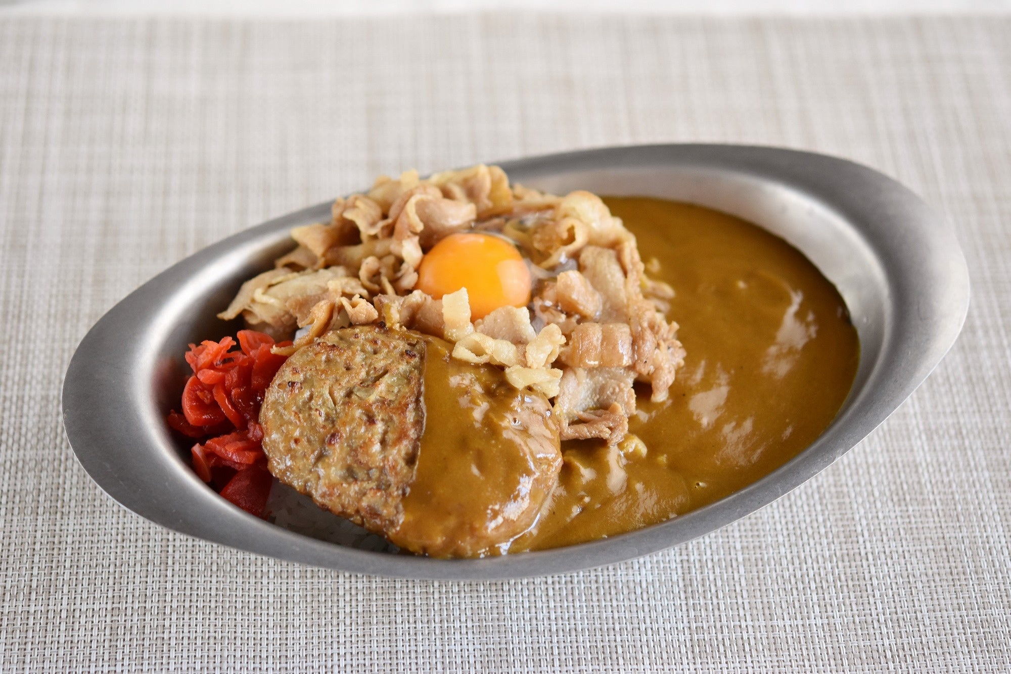 豚生姜焼きとハンバーグに生卵もオンした美味しいもの全部のせカレー!