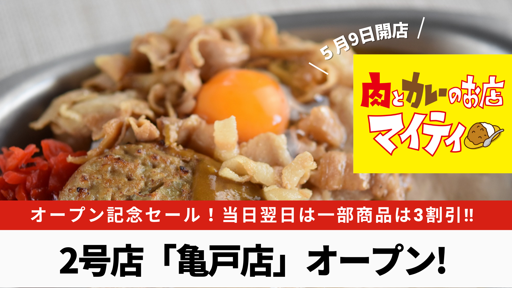 「肉とカレーのお店マイティ」は体育会系の学生が夢見るようなロマンあふれるガチ盛メガ盛のお店を目指してオープンしたカレー専門店です。東京都中野区落合にある1号店では男女問わず多くのお客様にガチ盛りを連日楽しんでいただいています。なお亀戸は主に若い単身者、子育ての世帯が中心に生活している人口約16万人のエリアです。テレワークの浸透に伴い増加したテイクアウト・中食のニーズにも対応し、自宅でもガチ盛りを満喫できるお店となっています。