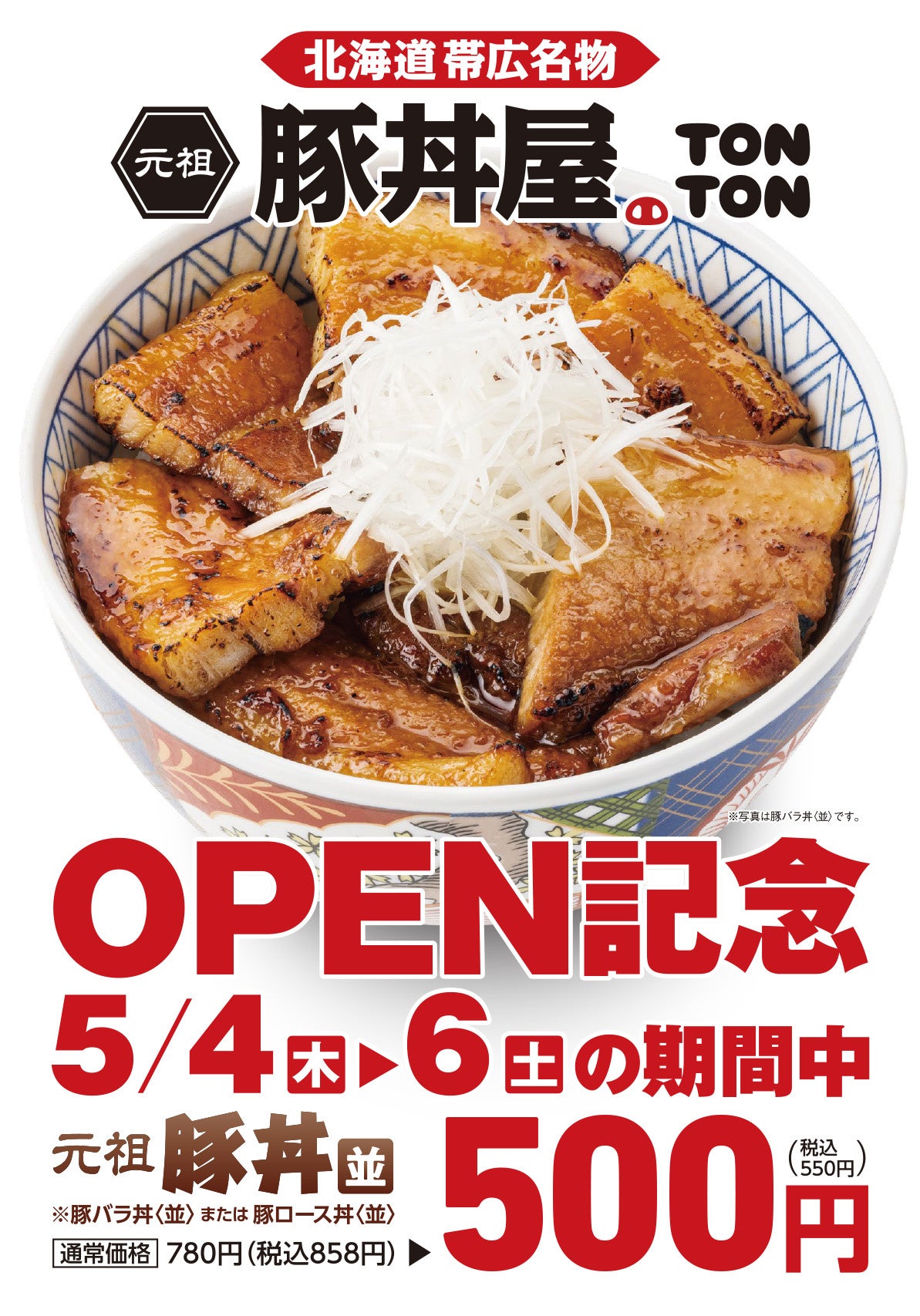 朝日町店のオープンを記念して、5/4(木)〜6(土)の3日間、当店自慢の「豚バラ丼〈並〉」または「豚ロース丼〈並〉」を特別価格500円(税込550円)にて提供いたします。