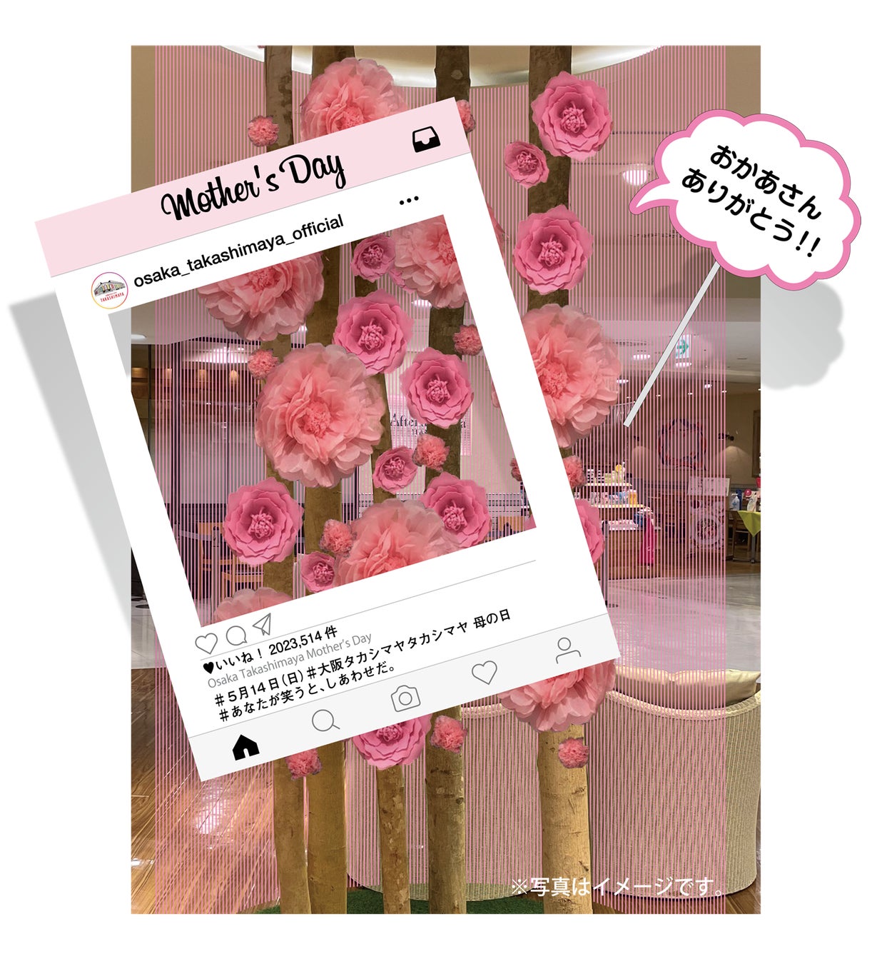 高島屋大阪店の「母の日」は、“自分も家族も笑顔で楽しめる”をテーマに、モノ・コト・イベントを提案します。2023年5月8日(月)から新型コロナが5類へ移行し、マスクを外す機会が少しずつ増えると予想されることから、マスクを外して笑顔で写真が撮れるチェキ撮影会や、スキンケアを重点的にできるエステメニューを企画しました。また、近年高まる「ご褒美需要」にも応えるべく、母の日ケーキや高島屋大阪店限定のテリーヌなどスウィーツも取り揃えています。