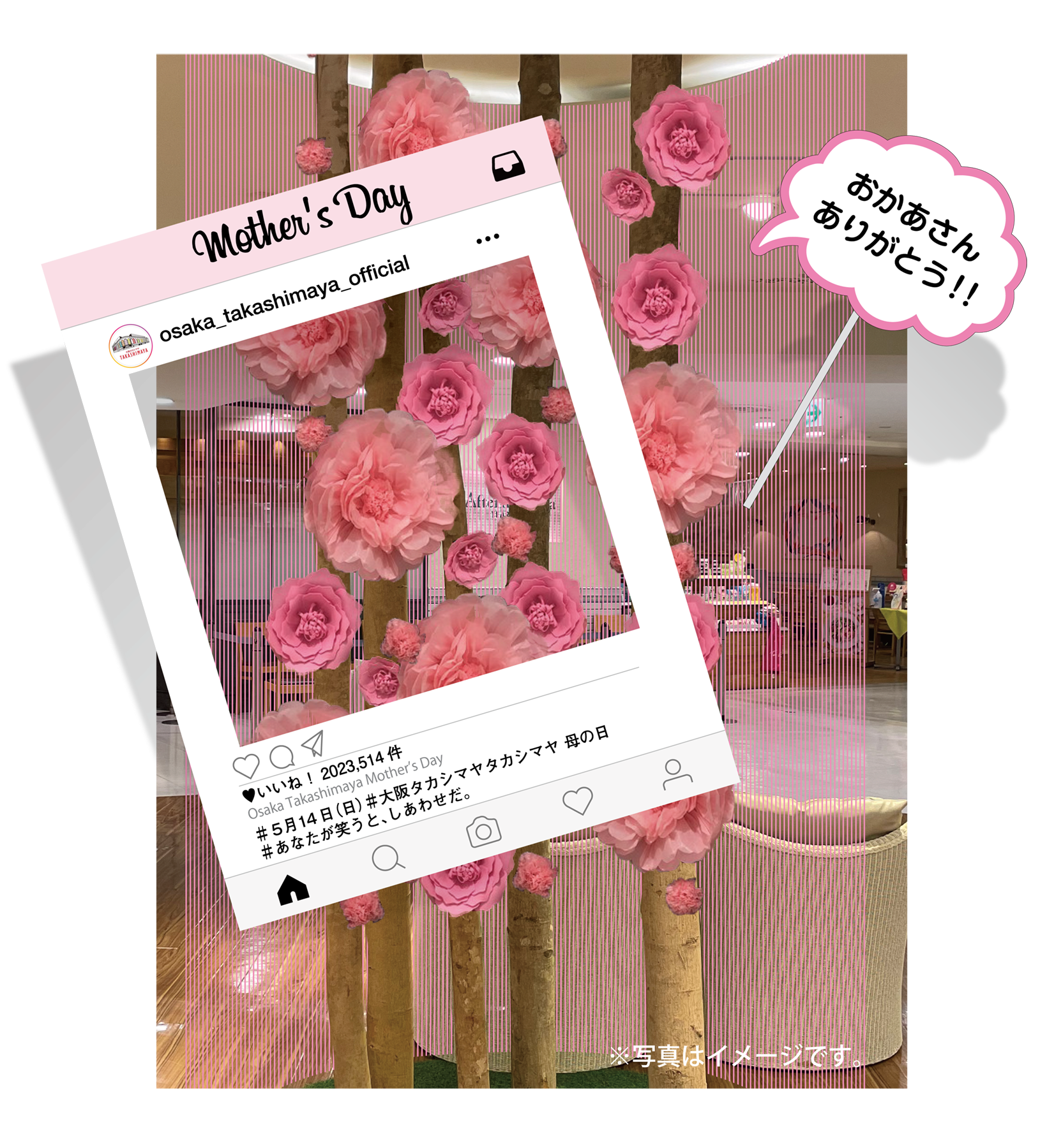 高島屋大阪店の「母の日」は、“自分も家族も笑顔で楽しめる”をテーマに、モノ・コト・イベントを提案します。2023年5月8日(月)から新型コロナが5類へ移行し、マスクを外す機会が少しずつ増えると予想されることから、マスクを外して笑顔で写真が撮れるチェキ撮影会や、スキンケアを重点的にできるエステメニューを企画しました。また、近年高まる「ご褒美需要」にも応えるべく、母の日ケーキや高島屋大阪店限定のテリーヌなどスウィーツも取り揃えています。