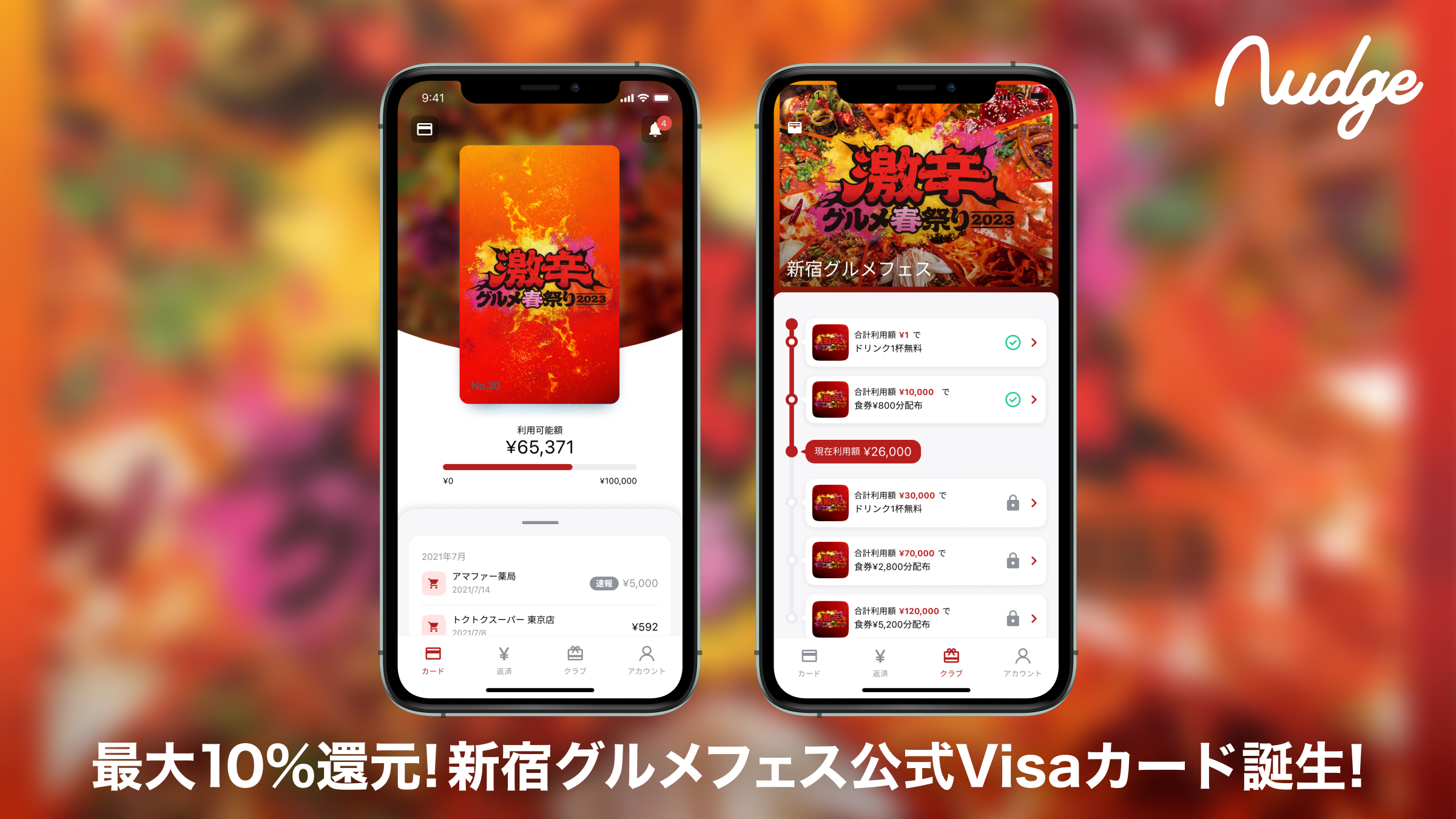 新たなムーブメントを生む街「新宿」で開催されるグルメイベントが公式Visaカードになって誕生します。激辛グルメ春祭りをはじめ、「ココに行けば美味しい物がいつもある!」と思っていただけるような様々なイベントを開催いたします。普段のお買い物でカードを使うだけで、今夏から「新宿グルメフェス」で使えるドリンク無料券や食券、会員限定NFTなどの特典を配布いたします。カードの累計利用額に応じた各種特典を順次追加していく予定です。