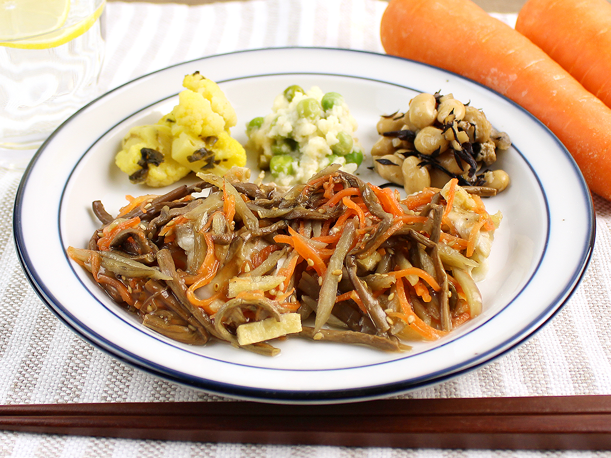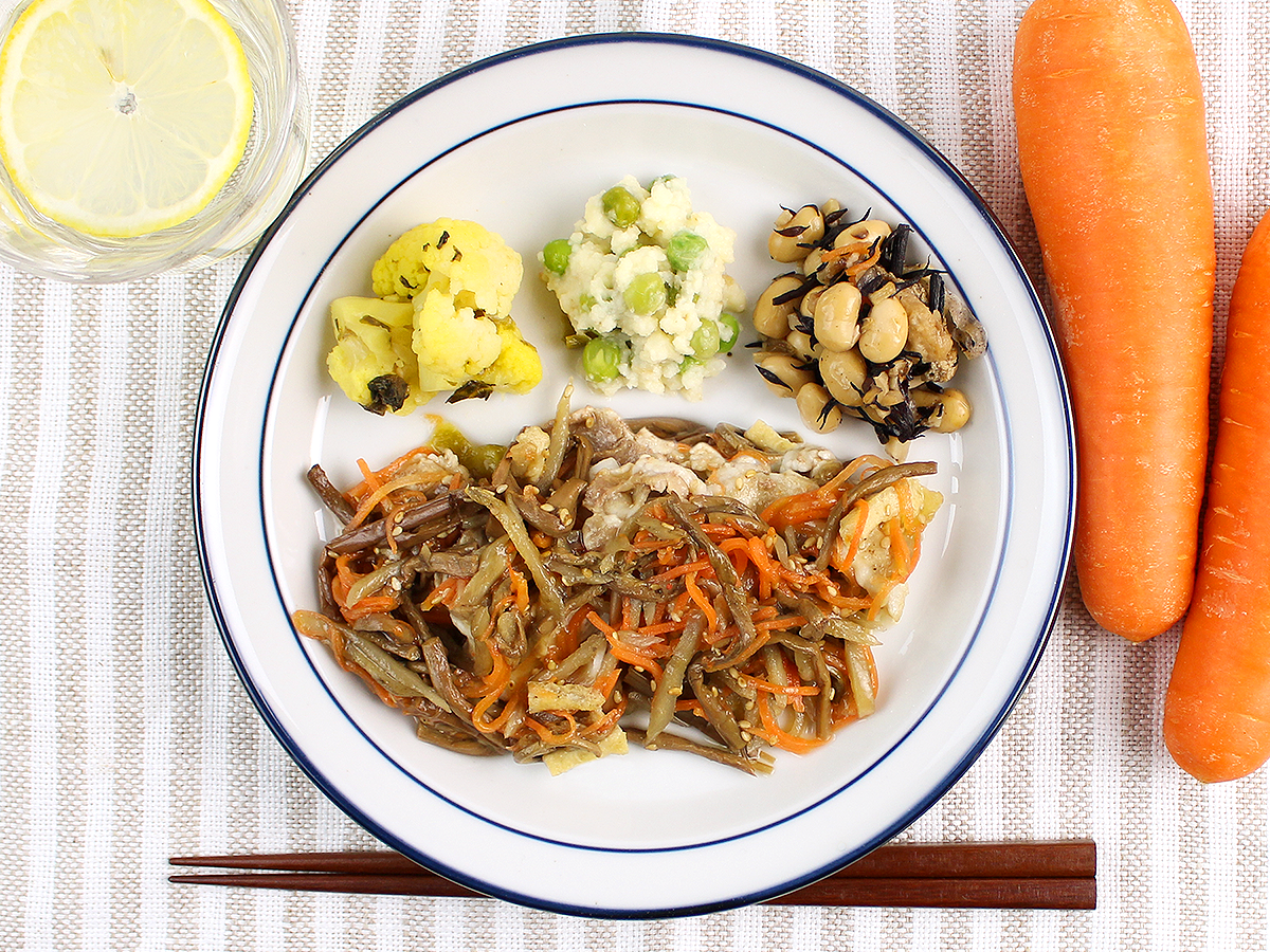 副菜は、カリフラワーの高菜和え、グリーンピースの入った豆ぽてと、ほんのり山椒味でしいたけ入りのひじきです。