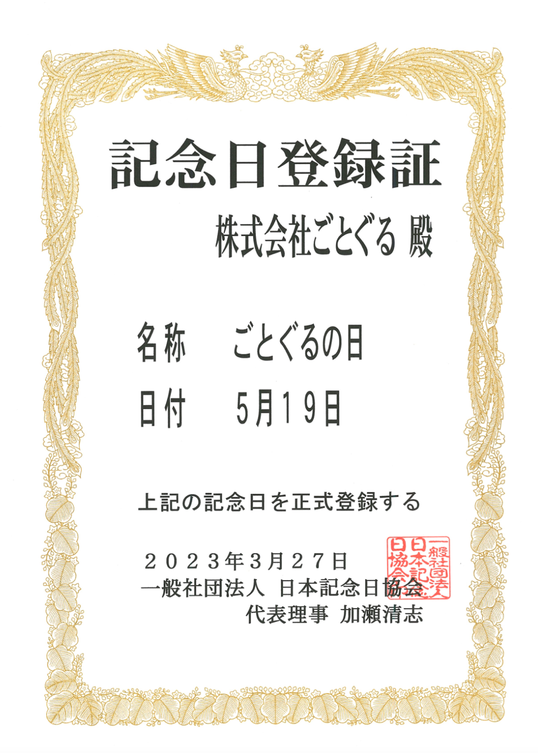 今回、より多くの方にご当地グルメに興味関心を持っていただき、購入する機会を創出するため、ご当地グルメを略した「ごとぐる」にちなんだ5月19日を「ごとぐるの日」とし、日本記念日協会に登録いたしました。