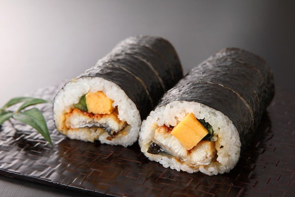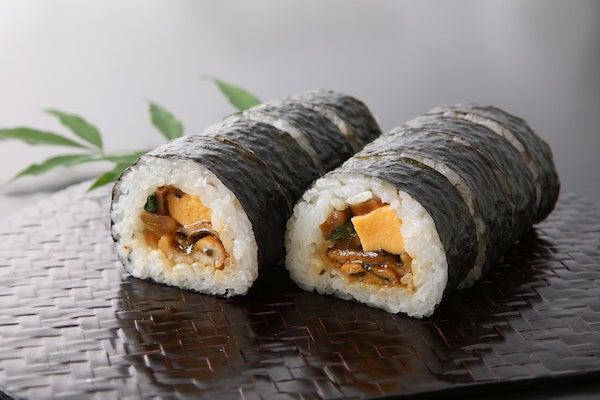 椎茸、厚焼き玉子、かんぴょうなど定番の食材に加え、1本物の「真穴子」と、小松菜を加えた旨みたっぷりの巻き寿司です。