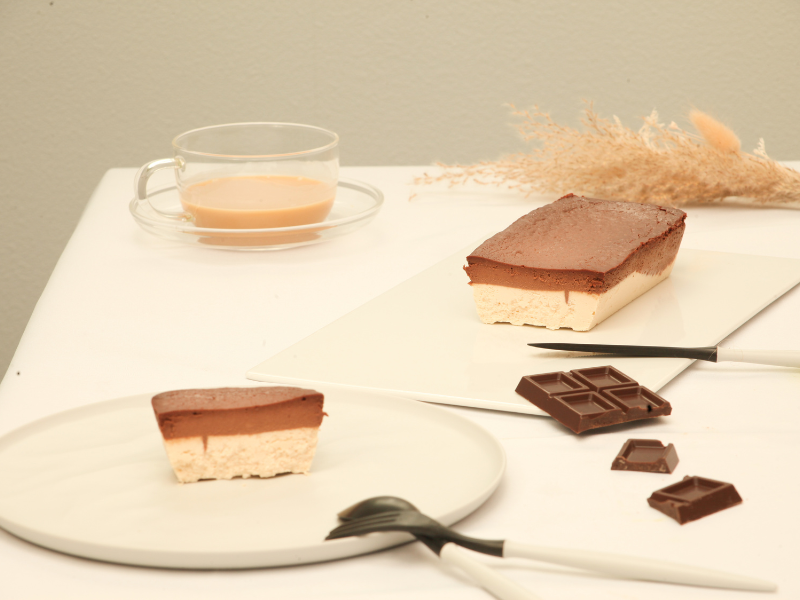 クリームチーズとサワークリームが織りなす、さっぱり濃厚なチーズケーキとガーナ産カカオ豆を使用した上品で濃厚なチョコレートの2層のチョコレートチーズケーキです。口に入れた瞬間からカカオの芳醇な香りとチーズケーキの濃厚な味わいが口いっぱいに広がり、カカオの深いコクの余韻が残ります。