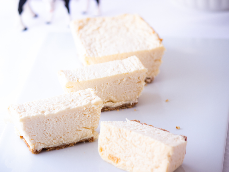 なめらかでクリーミーなクリームチーズとサワークリームをメインに、生クリームを使用し、よりなめらかに仕上げ、とろける食感と口どけの良さにこだわったチーズケーキです。お年寄りから小さな子どもまで食べられるよう、レモン/香料は使っておりません。