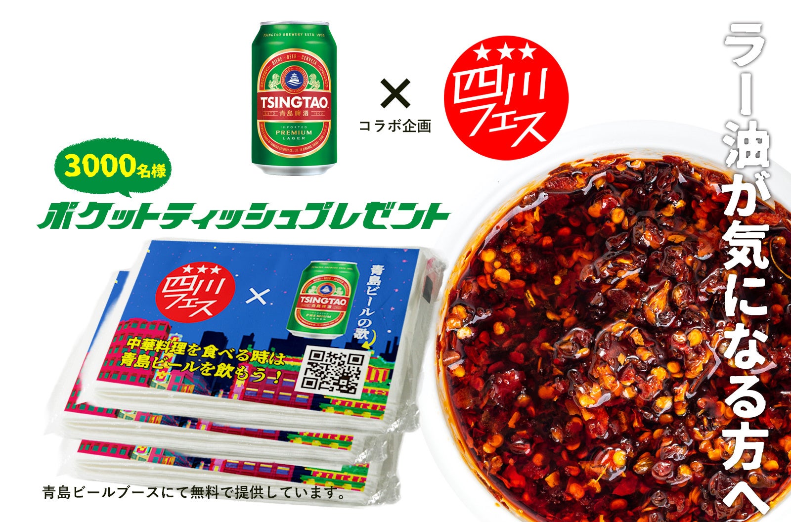 青島ビールブースでは3000名様に無料でポケットティッシュをお渡しします。ラー油で口元の汚れ気になる方はぜひお使いください!