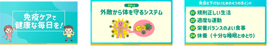 昨年展開を開始した本教材は、全国41都道府県177校の学校からお申し込みをいただき、小学6年生約1万人に利用いただき、授業を受けた児童の約9割から「授業に満足した」という回答がありました。「免疫の働きが分かり、もっとたくさん免疫のことを知りたい」「免疫ケアの方法が分かり、実践しようと思った」など、免疫を通じてセルフケアすることの重要性について、前向きなコメントが多数ありました。また本教材は進行台本に沿って授業を進めるパッケージのため、小学校教員の授業準備の負担が少ないことも特長で、先生方からも大変好評いただきました。