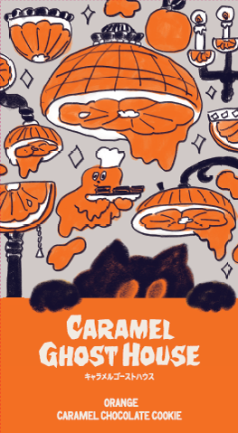 オバケ自慢のキャラメルと、甘酸っぱくほろ苦いオレンジが相性抜群!オレンジピールを混ぜ込んだクッキーでキャラメルチョコレートをサンドした、食べるほどにひろがる爽やかなオレンジの風味をお楽しみいただける夏にオススメの逸品です。