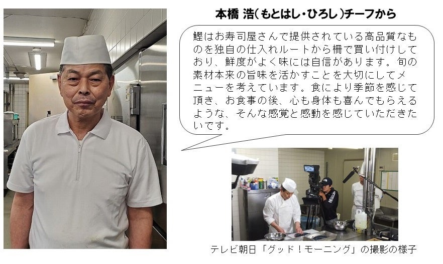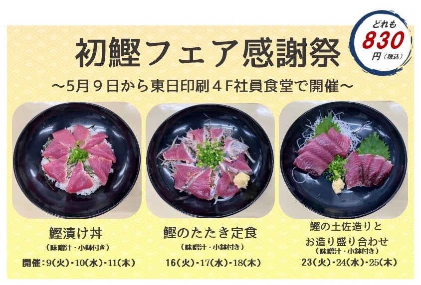 今回は、当食堂をご利用いただいている皆さんに感謝の意味も込めた特別フェアとなります。都内の懐石料理店で32年勤めた当食堂のチーフが、腕によりをかけて旬の初鰹を使ったメニュー3種類を週替わりでご提供します。ぜひお気軽にお越しください。