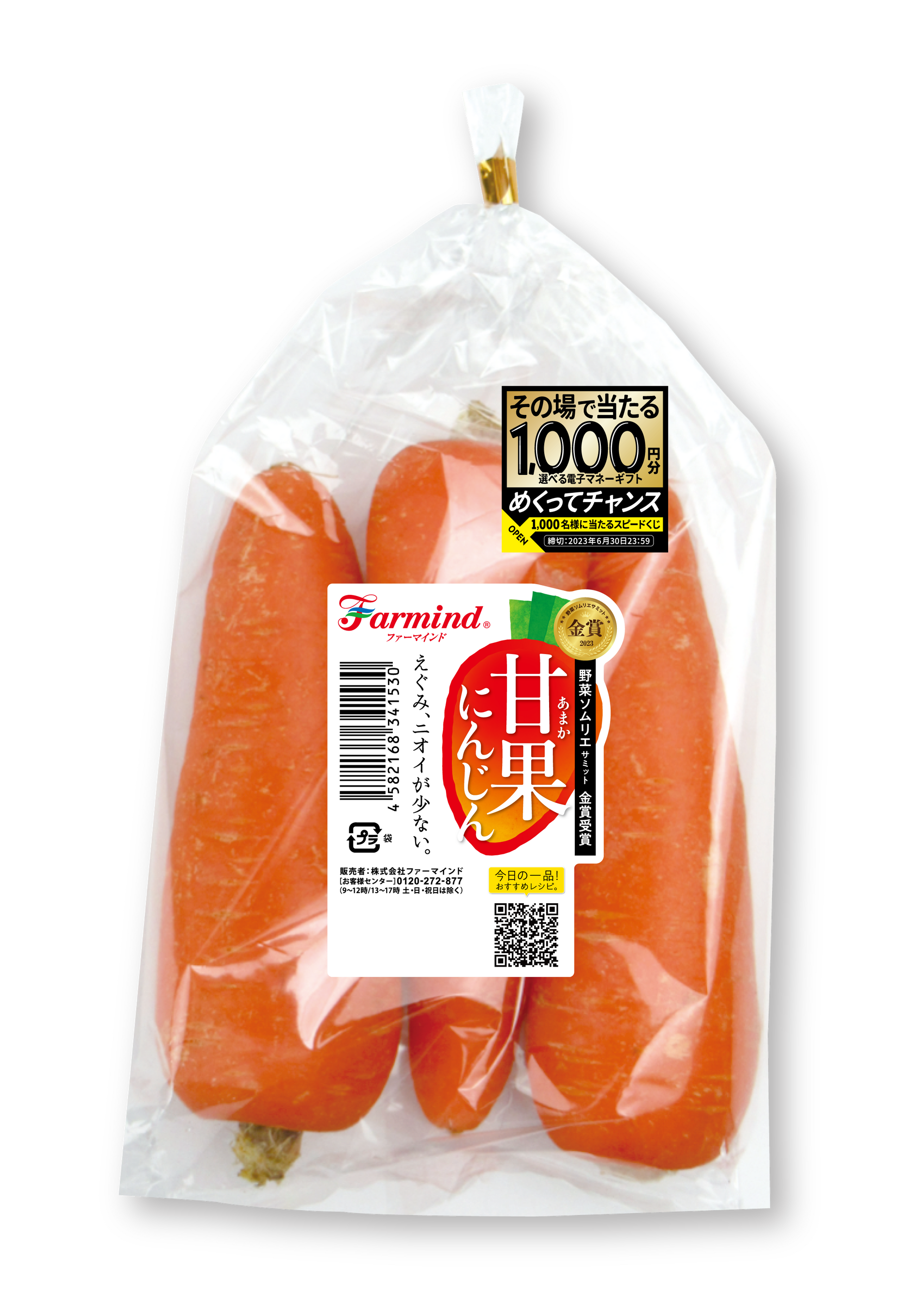にんじんは、野菜スティックやサラダなど、加熱せず生で食べたいと思っている消費者が実は約6割※もいます。ファーマインドの甘果にんじんは、2023年2月に野菜ソムリエサミットで金賞を受賞し、加熱しても、生で食べてもえぐみが無く甘くとても食感が良いと、野菜のプロが認めた品質とおいしさで、消費者の声にお応えしています。(※2022年4月:自社運営サイト「食宣伝.com」のユーザー833人を対象にしたアンケート調査)