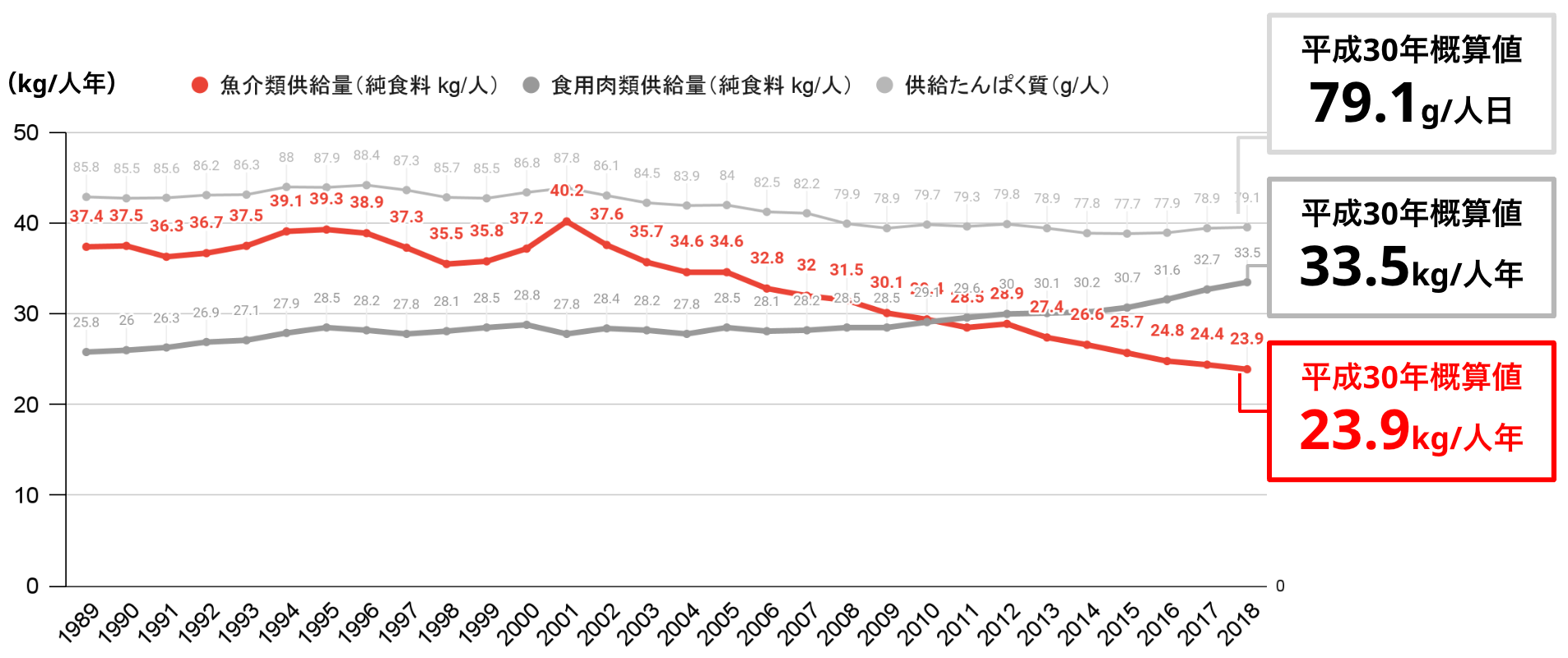 *1 水産庁HP 令和元年度水産白書 第1部第4章 (2)水産物消費の状況より 図4-3 食用魚介類及び肉類の1人1年当たり消費量(純食料)とたんぱく質の1人1日当たり消費量の推移