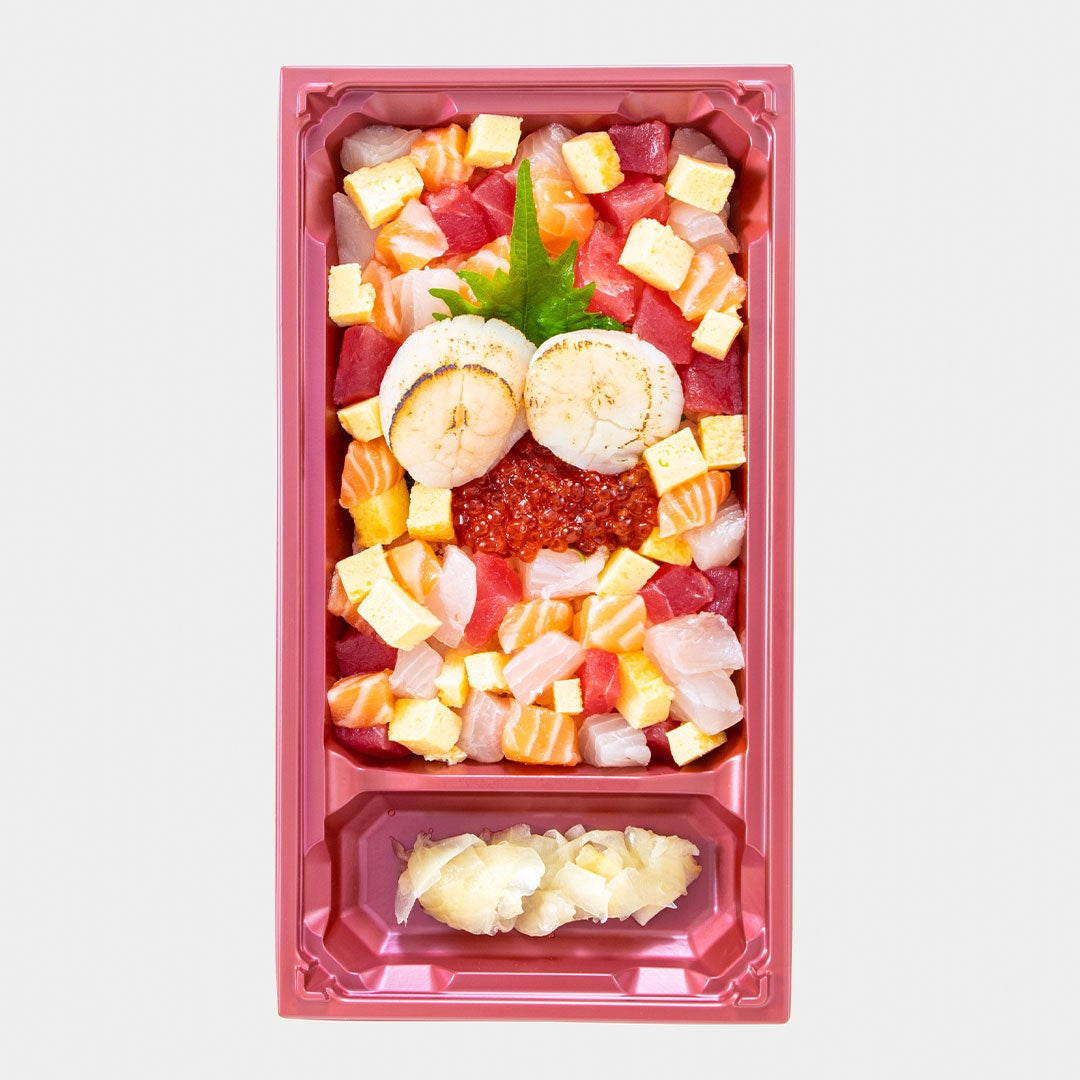 年間5万個以上の販売実績を誇るsakana baccaで最も売れているばらちらし寿司。マグロ、白身、サーモン、ホタテなど7種の具材を、度重なる試作を経て職人が絶妙なバランスでちりばめました。赤酢を使った酢飯は風味豊かで、赤みがかった酢飯は視覚からも食欲をわかせます。