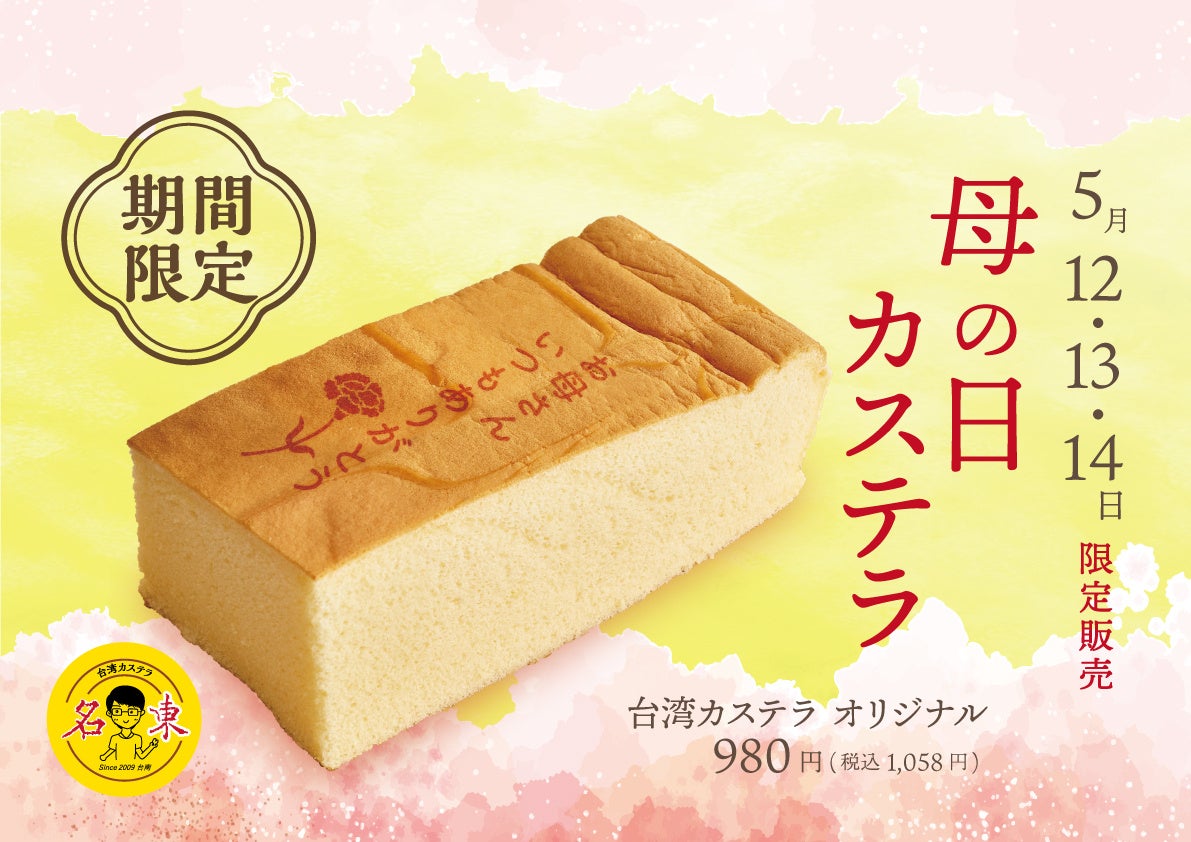フークル株式会社(所在地:東京都港区 代表取締役:河﨑孝文)が展開する、老舗台湾カステラ店「名東 キラリナ吉祥寺店」は、5月12日(金)13日(土)14日(日)の3日間、母の日のメッセージ焼印入りカステラを限定販売いたします。