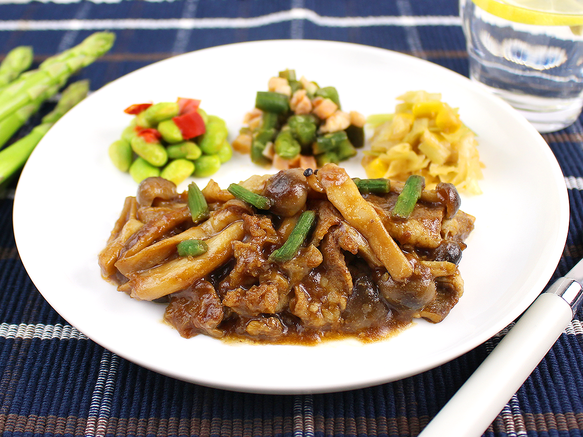 洋食の定番メニュー、薄切り牛バラ肉を濃厚なデミグラスソースで合わせたハッシュドビーフです。赤ワインを隠し味に加え、コク深く仕上げました。付け合わせは甘く炒めた玉葱をまとったしめじと、アスパラのボイルです。ナッシュバンズパンとの相性もいいので是非お試し下さい。