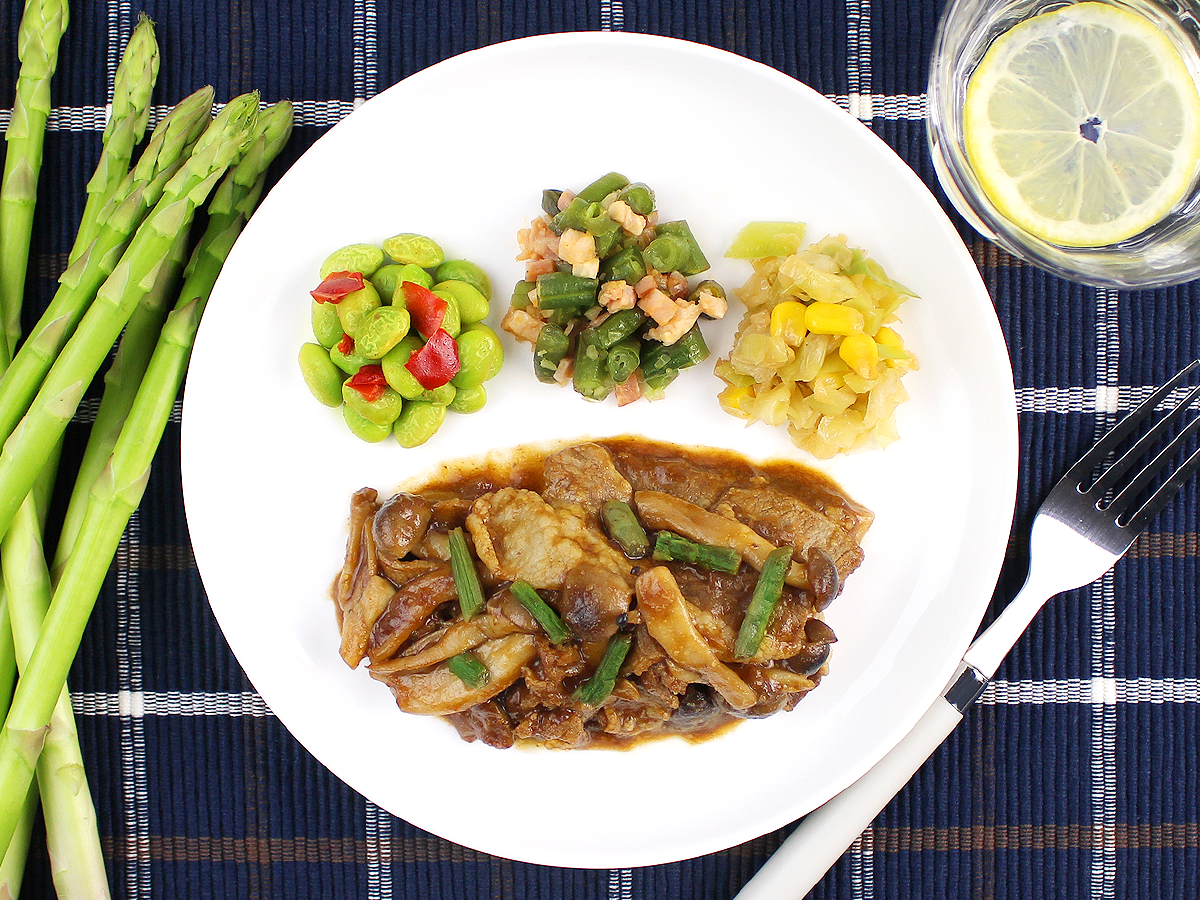 副菜は、さっぱりとした枝豆サラダ、ベーコン入りのインゲンのトマトマリネ、ローストしたガーリック香るキャベツです。