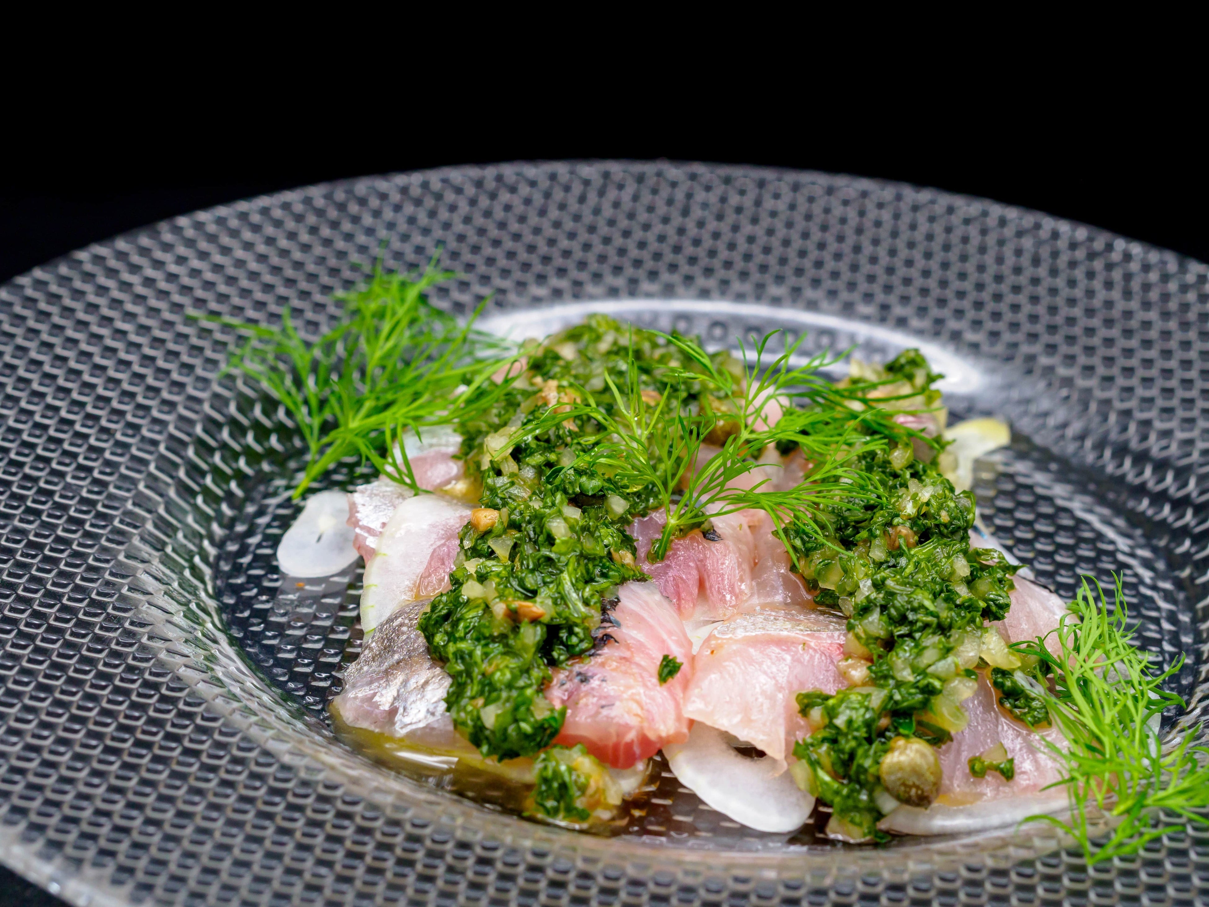 旬の真鯵を相性の良いパセリのソースでマリネにいたしました。