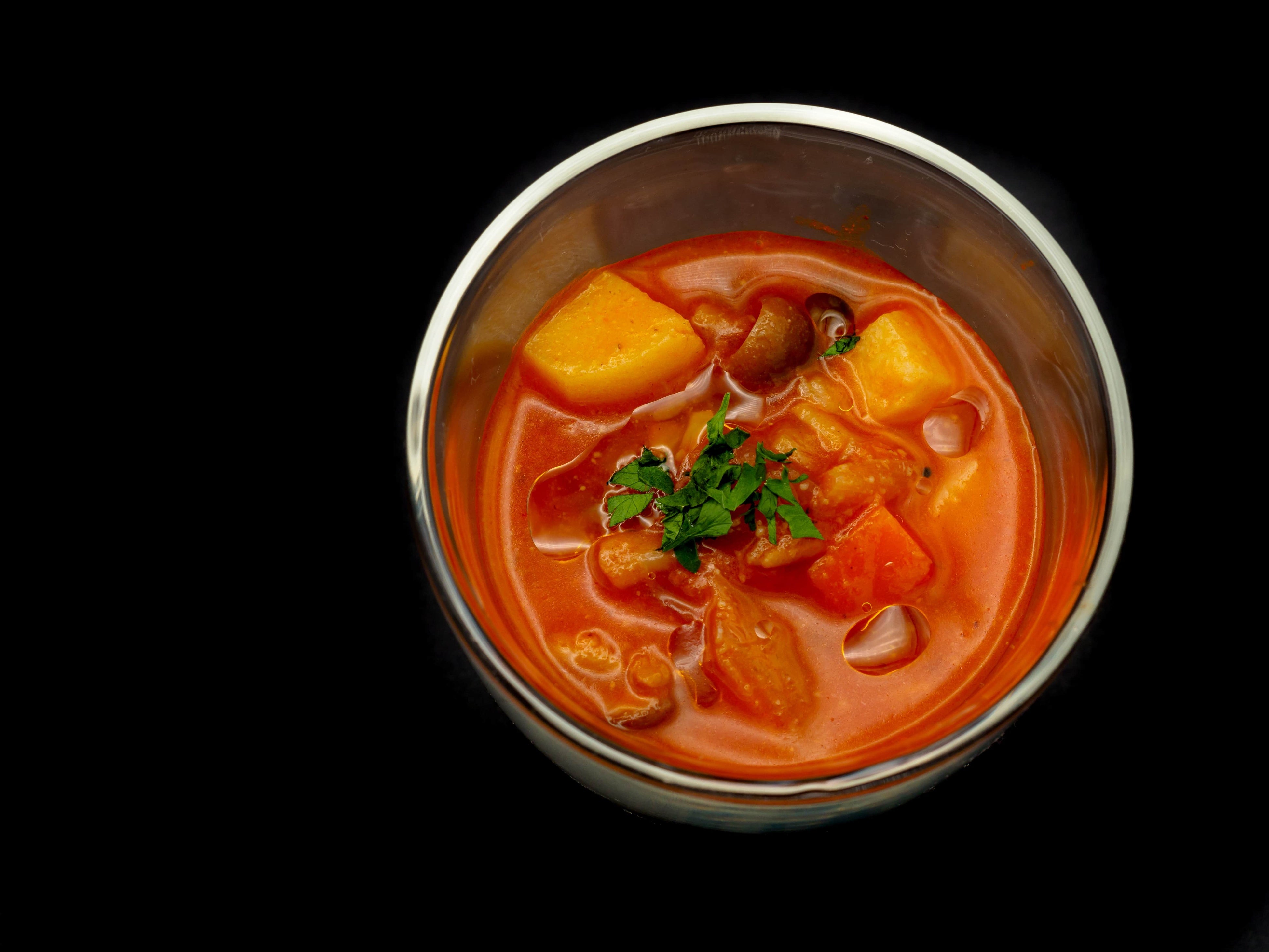 玉ねぎ、人参、セロリ、白菜、しめじ、しいたけ、じゃがいも、ズッキーニ、たっぷりと8種の野菜をゴロゴロと入れ、さっぱりとしたトマトの風味に野菜の甘みが溶け込んだスープに仕上がりました。