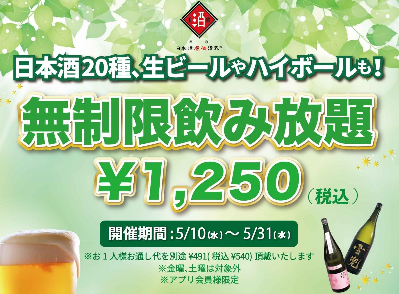 日本酒原価酒蔵全店(http://sake-genkabar.com)にて時間無制限飲み放題を5/31(水)まで期間限定で実施致します。獺祭など特定名称酒をメインとした日本酒20種、生ビールやハイボールも含む飲み放題メニューが時間無制限で以下の価格となります。