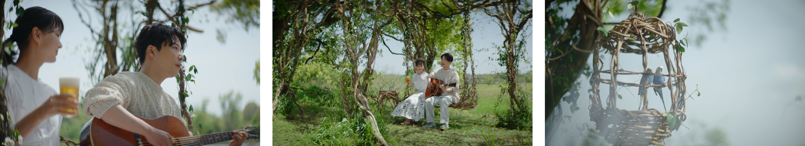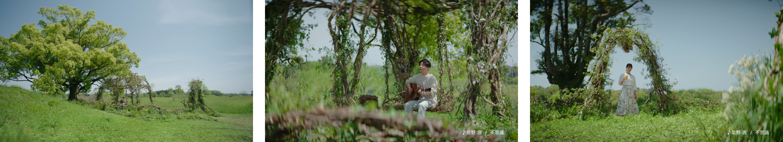 本作の舞台は、気持ちのいい緑の景色と爽やかな⻘い空が広がる草原です。穏やかな日差しの中、大きな木の下にあるツタで造られた家で星野さんが歌うのは、楽曲「不思議」の弾き語りアレンジです。