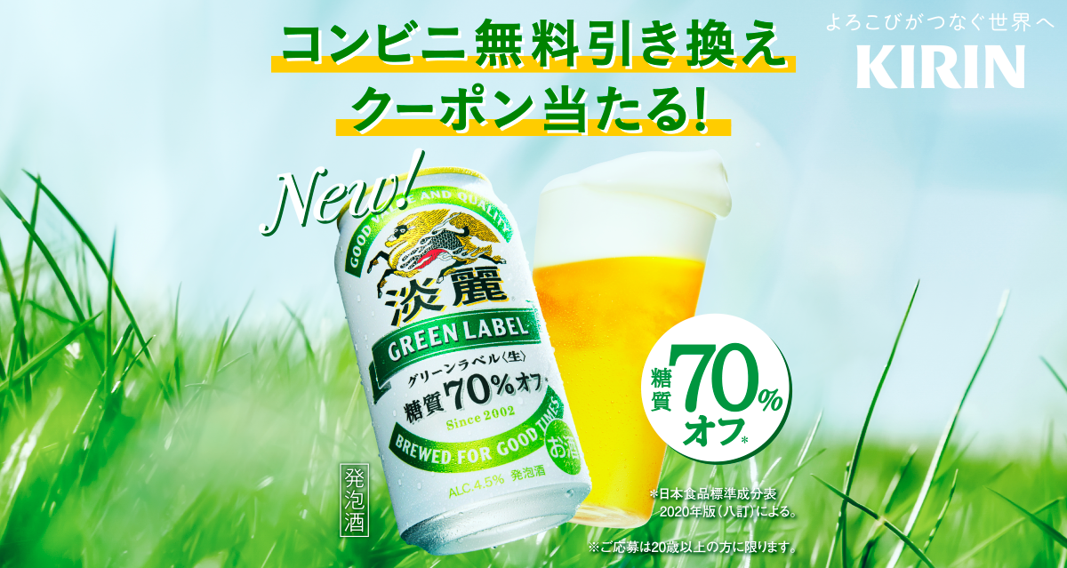 当選すると、「淡麗グリーンラベル」350ml缶1本を対象店舗の店頭で引き換えることができる無料引き換えクーポンがもらえます。
