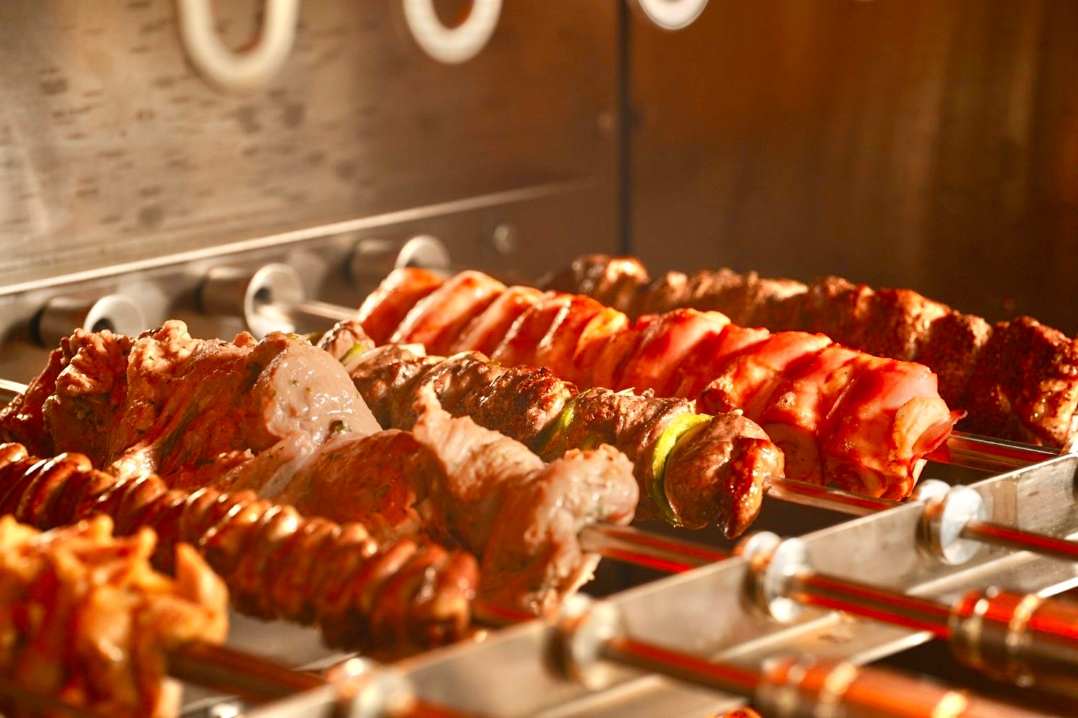 シュラスコとは、牛肉や豚肉や鶏肉、野菜やパイナップルなどを鉄製の串に刺し通し、岩塩やスパイスやハーブを使って、遠赤外線効果でじっくりと焼き上げるブラジル式のバーベキュー料理。各テーブルを周りながら目の前で豪快にナイフでカットされる、外はカリッと香ばしく、中はジューシーな焼き立ての肉を、食べ放題で満足行くまで味わうことができる。