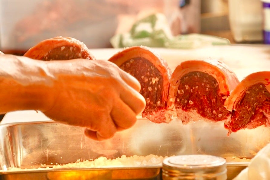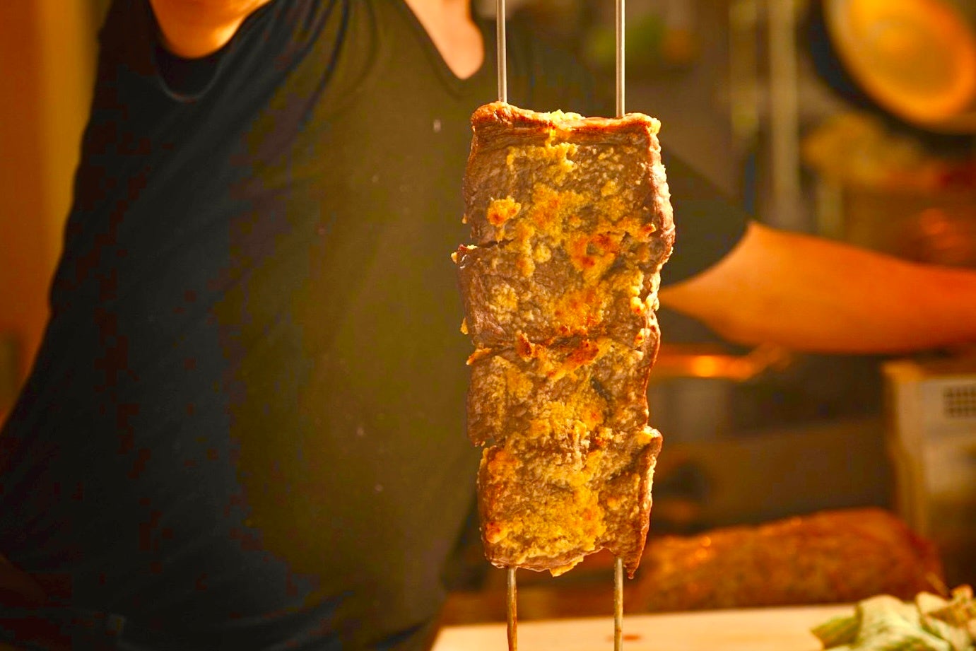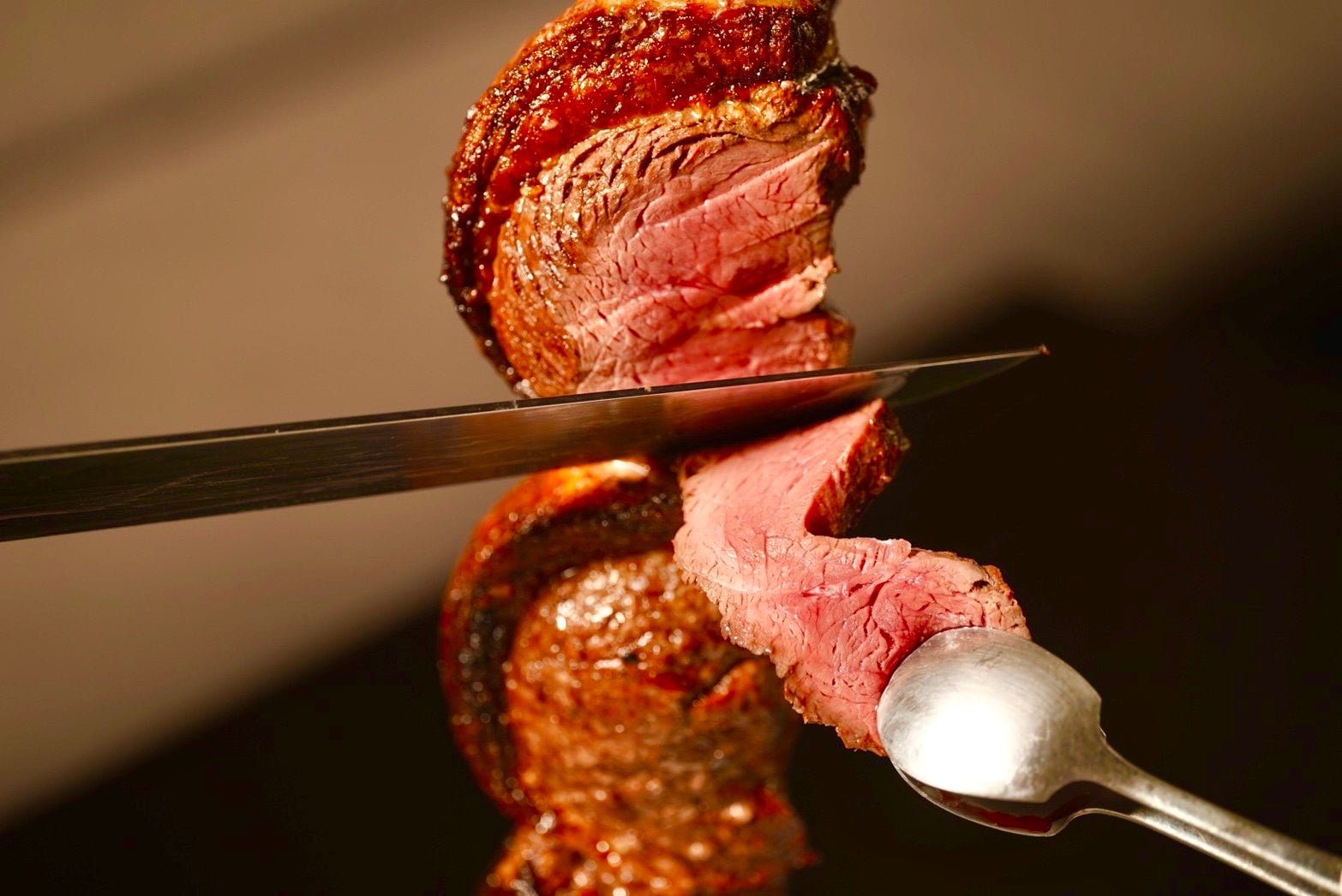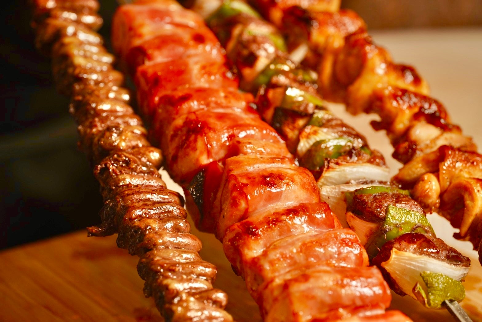 シュラスコとは、牛肉や豚肉や鶏肉、野菜やパイナップルなどを鉄製の串に刺し通し、岩塩やスパイスやハーブを使って、遠赤外線効果でじっくりと焼き上げるブラジル式のバーベキュー料理。各テーブルを周りながら目の前で豪快にナイフでカットされる、外はカリッと香ばしく、中はジューシーな焼き立ての肉を、食べ放題で満足行くまで味わうことができる。