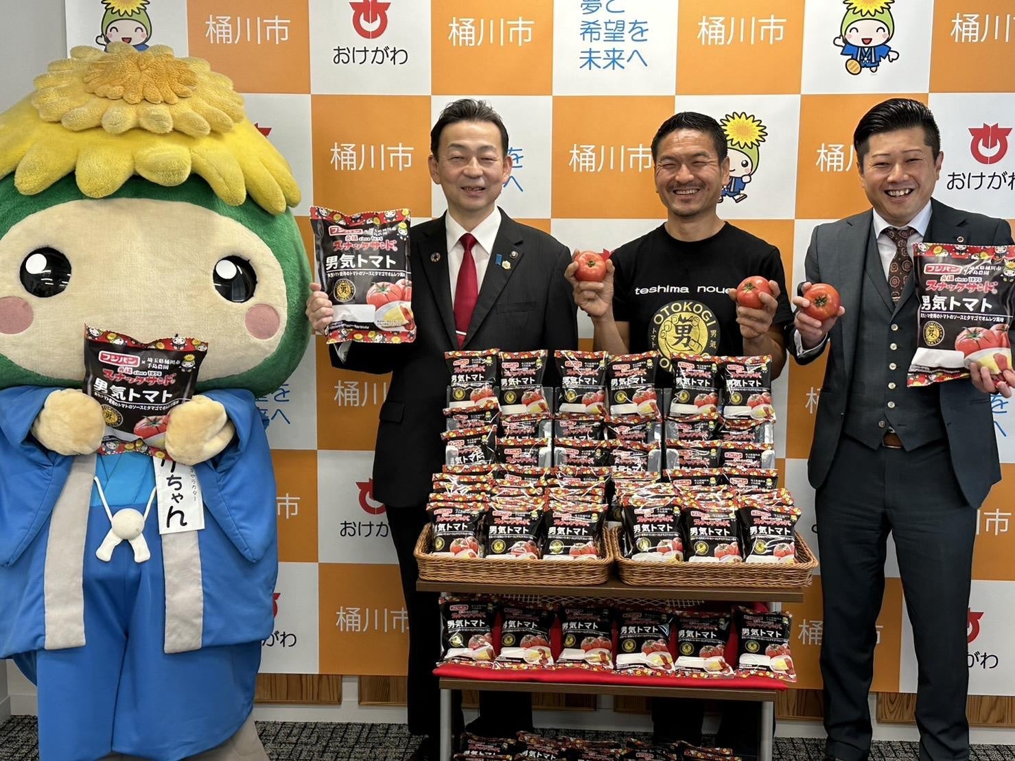 2023年4月28日(金)に埼玉県桶川市 小野克典市長を手島農園 手島孝明社長とともに表敬訪問いたしました。昨年8月、9月に発売した『スナックサンド男気トマト』が地元を中心に盛り上がりをみせたことから、発売2年目となる『スナックサンド男気トマト』を通して桶川市の知名度アップや、桶川産農産物の地産地消による地域貢献への想いをお伝えし、小野市長から激励をいただきました。