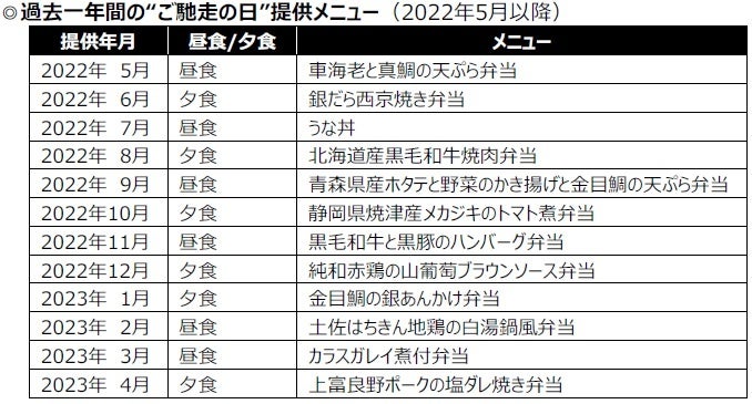 当社では、栄養バランスが整った食事を摂ることによる“体の栄養”に加え、“心の栄養”につながる取り組みとして、“ご馳走の日”を月に1回設けています。“ご馳走の日”には、各地域の特産品・名産品などを使用した特別メニューを、通常のお弁当(普通食)と同じ540円(税込・おかずのみ)で提供。普段はなかなか食べる機会の少ない食材やメニューで、届くまでの待ち遠しさや誰かに自慢したくなる気持ちを感じていただけるようなお弁当をお届けしています。