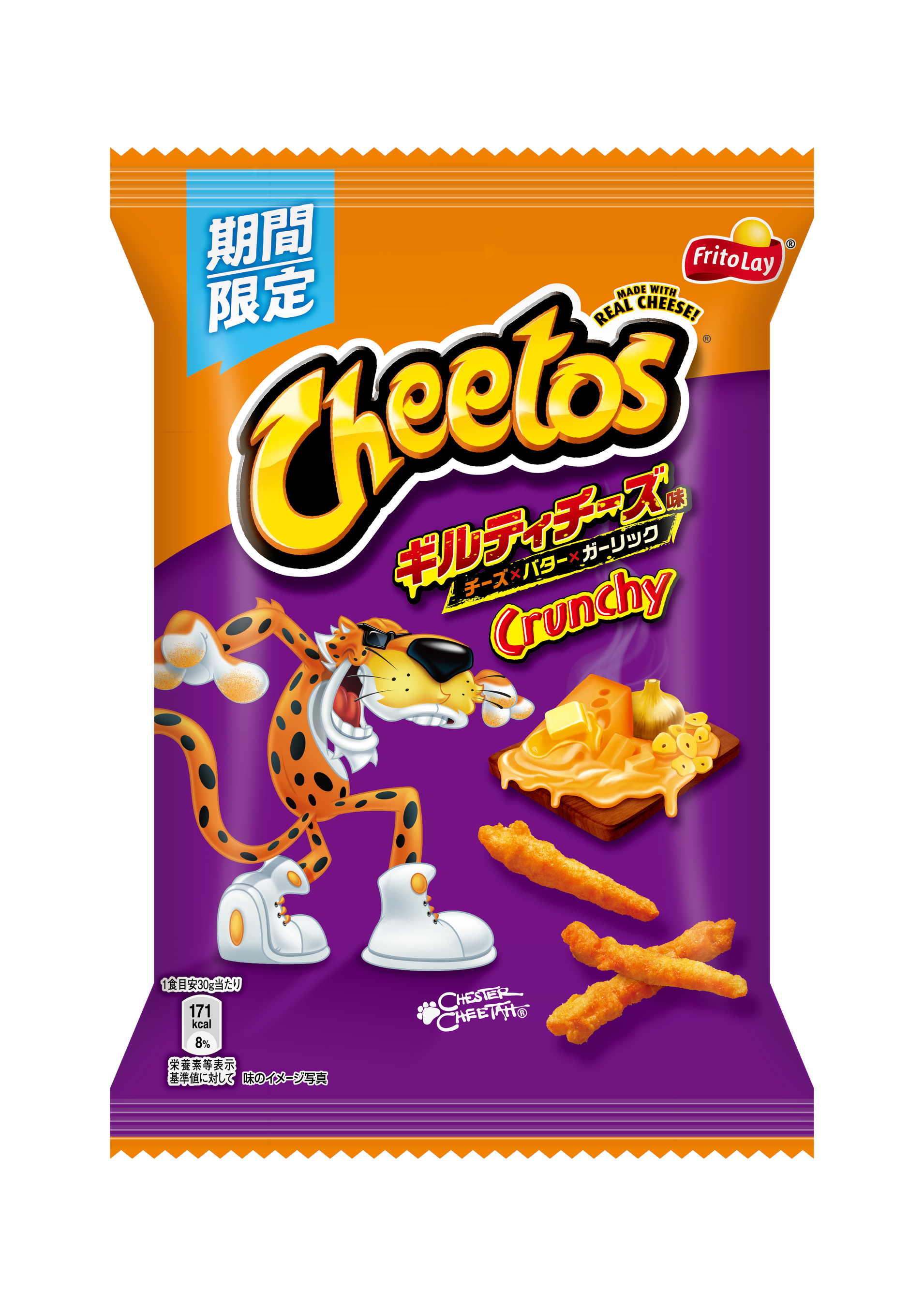 パッケージには、とろけたチーズとバター、焦げ目のあるニンニクをデザインし、インパクトのある紫色を配色することで、いたずら心溢れるチートスの世界観を表現しました。