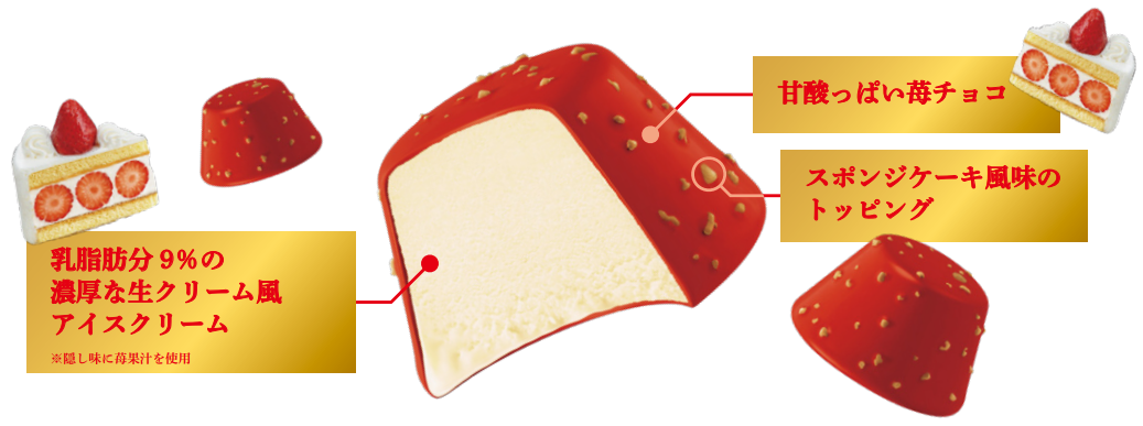 生クリーム風アイスクリームを苺のように甘酸っぱくて鮮やかな赤い苺チョコでコーティングし、さらに苺チョコにはスポンジケーキ風味のトッピングを混ぜ込むことで、苺のショートケーキの再現性が高まり、苺のショートケーキを食べているような複合食感をお楽しみいただけます。