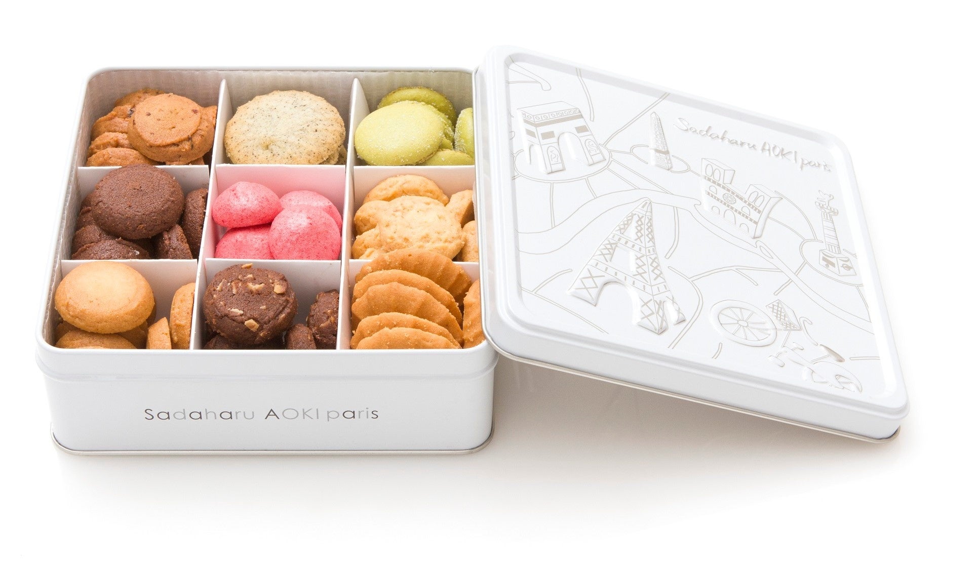 白とシルバーを基調としたパリの街並みが描かれた缶に、こだわりの製法で作り上げた焼菓子を