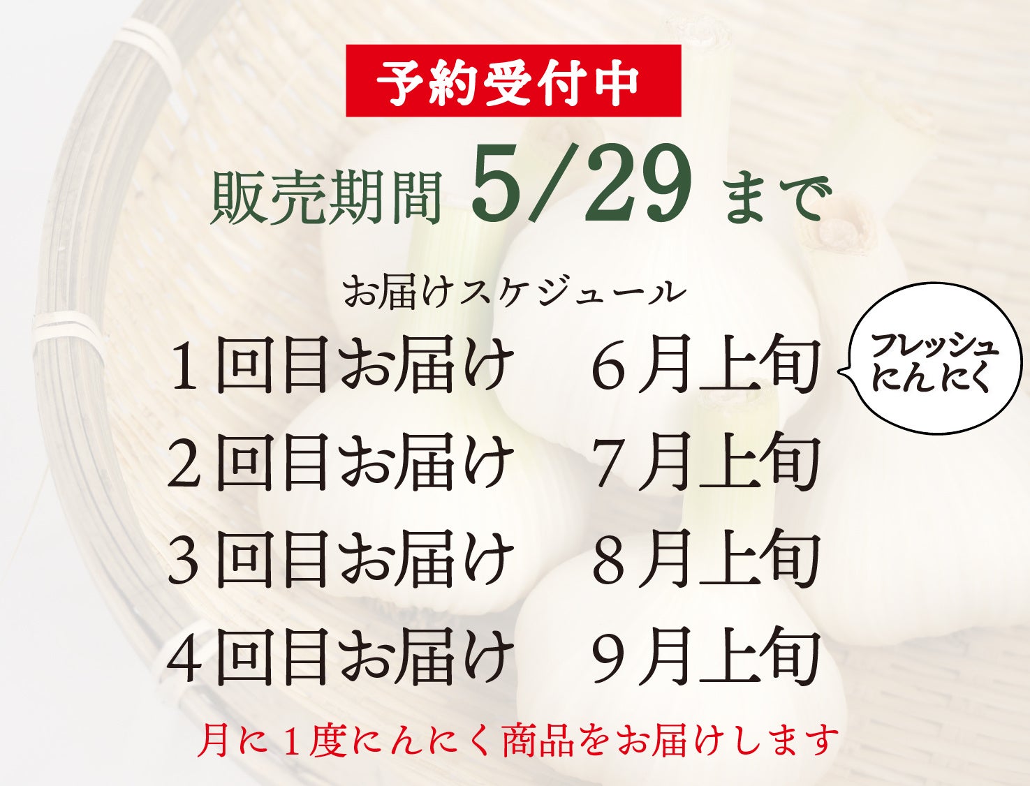 「にんにく詰め合わせ 定期便4回コース」の販売受付は、2023年5月9日から29日までの期間限定です。