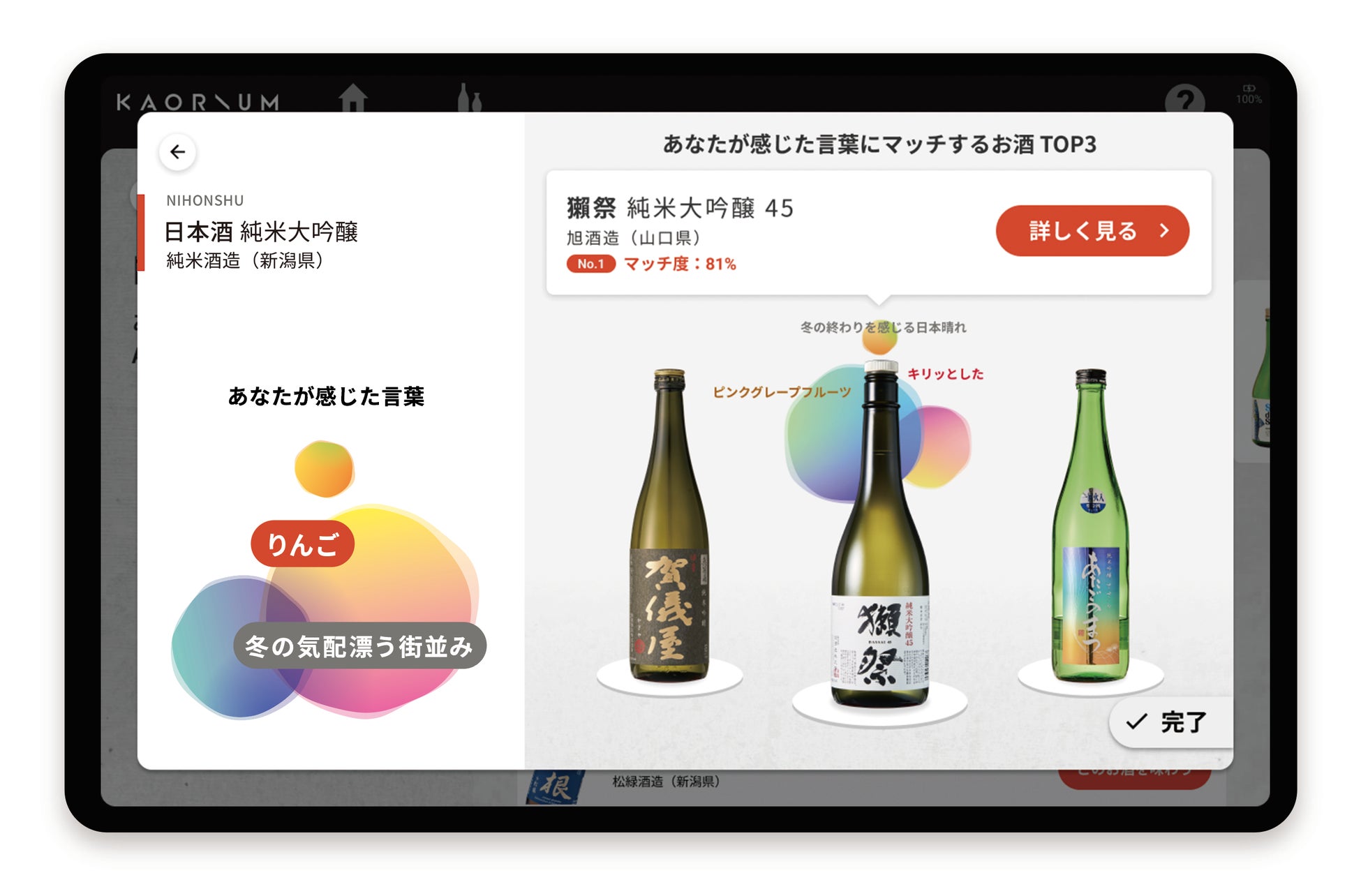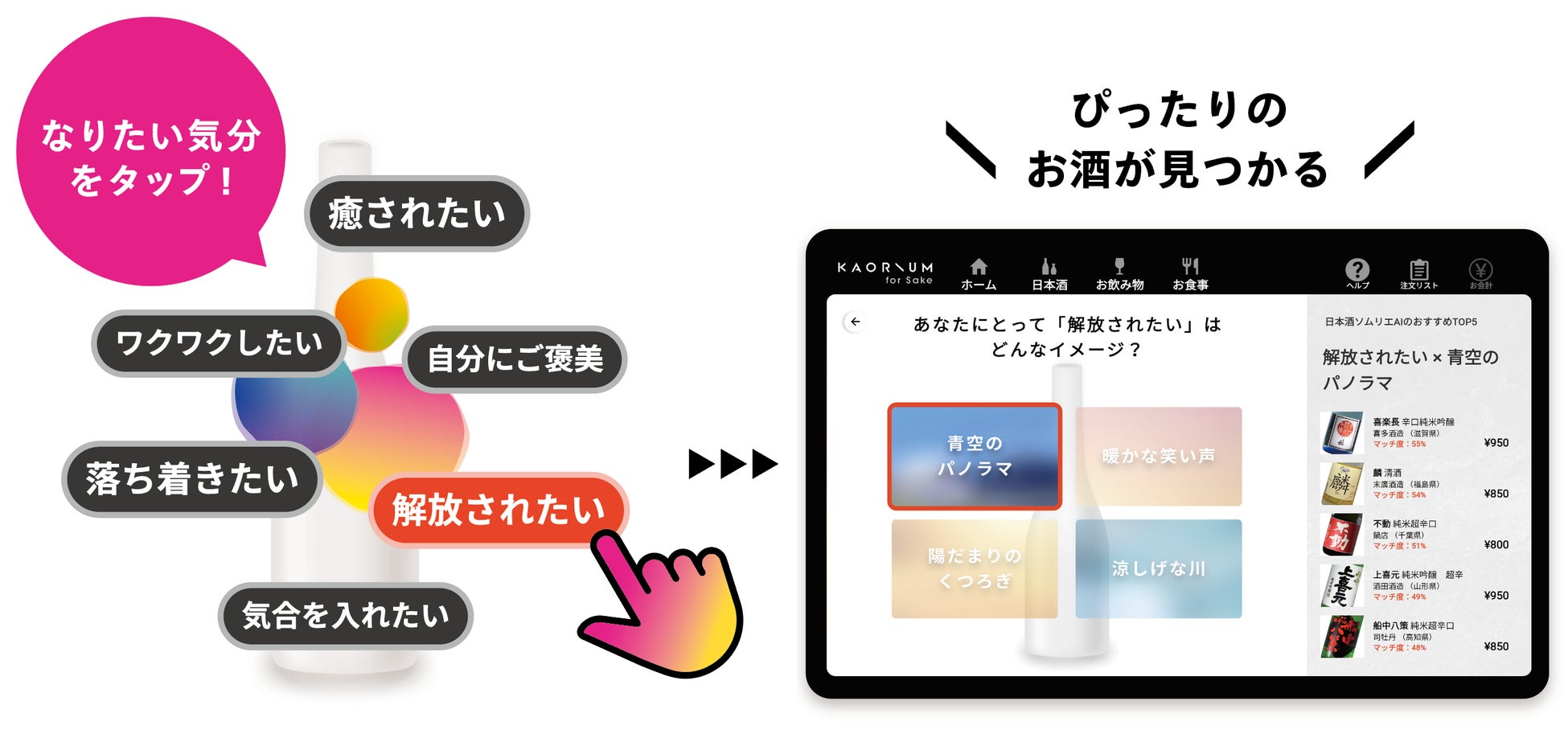 種類の多い日本酒はどれを選んでいいかわからないもの。KAORIUM for Sakeは、「解放されたい」「ワクワクしたい」といったなりたい気分や、「個性的」「フルーティ」といった好みの味わいに合わせて、AIが店頭にある日本酒とのマッチ度を解析しぴったりのお酒をレコメンドします。これにより、直感的に今欲しいお酒を選ぶことができます。